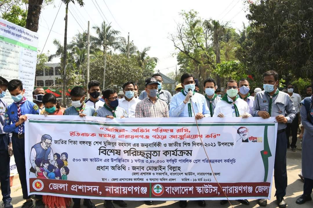 “আঙ্গিনা অফিস পরিচ্ছন্ন রাখি, ইতিবাচক স্বপ্নময় নারায়ণগঞ্জ গঠনে আত্মনিয়োগ করি” শ্লোগানকে সামনে রেখে বাংলাদেশ স্কাউটস, নারায়ণগঞ্জ জেলার ৫০০ জন সদস্য মোট ৩৪৮৫০০ বর্গফুট পাবলিক প্লেস পরিচ্ছন্নকরণ কর্মসূচিতে অংশ নেন।