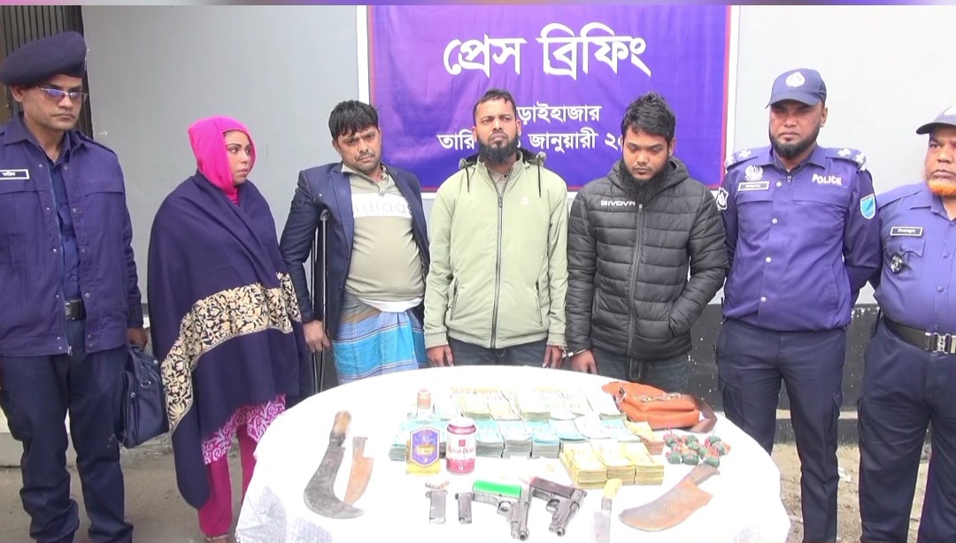 আড়াইহাজার থানা পুলিশ জানায়, উপজেলার হাইজাদি ইউনিয়নের ধন্দি ভিটি কামালদি এলাকার বাসিন্দা নাঈম (৩৮) এর বসতবাড়িতে তল্লাশি চালিয়ে ২টি পিস্তল, ২টি ম্যাগাজিন, ৩ রাউন্ড পিস্তলের গুলি, ১৬ লাখ ৯০ হাজার টাকা , ১০৫ পিস ইয়াবা এবং আনুমানিক ১৪–১৫টি দা, ছুরি ও চাকুসহ বিভিন্ন দেশীয় অস্ত্র উদ্ধার করা হয়।