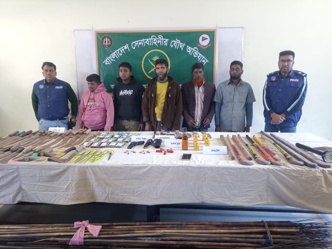 ত্রয়োদশ জাতীয় সংসদ নির্বাচনকে সামনে রেখে নারায়ণগঞ্জের আড়াইহাজার মেঘনা নদী পরিবেষ্টিত চরাঞ্চল কালাপাহাড়িয়া ইউনিয়নের একটি বিদেশী আগ্নেয়াস্ত্র সহ বিপুল পরিমান দেশীয় অস্ত্রশস্ত্র ককটেল গোলাবারুদ উদ্ধার করেছে। এ সময় পাচঁ সন্ত্রাসীকে হাতেনাতে গ্রেফতার করে সেনাবাহিনী।