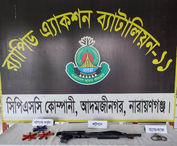 নারায়ণগঞ্জের আড়াইহাজার থানা থেকে লুট হওয়া ১ টি শটগান, ১৯ রাউন্ড শটগানের গুলি (লেডবল কার্তুজ) ও ১ টি হ্যান্ডকাফ উদ্ধার করেছে র্যাব-১১ সদস্যরা।