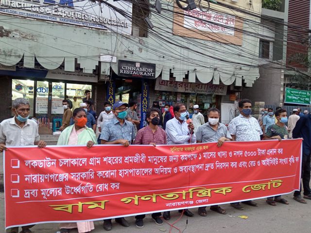 লকডাউন চলাকালে গ্রাম শহরের শ্রমজীবী মানুষের জন্য কমপক্ষে ১ মাসের খাদ্য ও নগদ ৫০০০ টাকা প্রদান, নারায়ণগঞ্জের করোনা হাসপাতালের অনিয়ম অব্যবস্থাপনা দ্রুত নিরসন ও বেড, আইসিইউ সংখ্যা বৃদ্ধি এবং দ্রব্যমূল্যের উর্ধ্বগতি রোধ করার দাবিতে বাম গণতান্ত্রিক জোট নারায়ণগঞ্জ জেলার উদ্যোগে আজ বিকাল ৫ টায় নারায়ণগঞ্জ প্রেস ক্লাবের সামনে মানববন্ধন অনুষ্ঠিত হয়। বাম গণতান্ত্রিক জোটের নারায়ণগঞ্জ জেলার সমন্বয়ক ও বাসদ নারায়ণগঞ্জ জেলার সমন্বয়ক নিখিল দাসের সভাপতিত্বে সমাবেশে বক্তব্য রাখেন কমিউনিস্ট পার্টির নারায়ণগঞ্জ জেলার সভাপতি হাফিজুল ইসলাম, বিপ্লবী ওয়ার্কার্স পার্টির জেলার নেতা রাশেদা বেগম, গণসংহতি আন্দোলনের জেলার সমন্বয়ক তরিকুল সুজন, সিপিবি নেতা দুলাল সাহা।