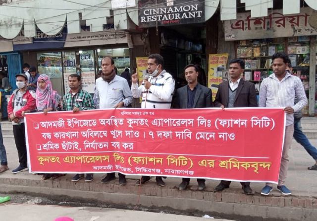 নেতৃবৃন্দ বলেন, আদমজী ইপিজেড-এর কুনতং ্অ্যাপারেলস লিঃ (ফ্যাশন সিটি) ১১ সেপ্টেম্বর থেকে লে-অফ করা হয়েছে। ৪ মাস যাবৎ শ্রমিকদের লে-অফের যে টাকা দেয়া হয় তাতে শ্রমিকদের জীবন চলে না। শ্রমিকরা পরিবার পরিজন নিয়ে অনাহারে অর্ধাহারে মানবেতর জীবনযাপন করছে। মালিক কবে কারখানা চালু করবে তা এখনো বলছে না। করোনাকালে নিত্য প্রয়োজনীয় দাম অনেক বেড়েছে। দাবি উঠেছে শ্রমিকদের মজুরি বৃদ্ধি, মহার্ঘ ভাতা প্রদানের। সেখানে কুনতং অ্যাপারেলস লিঃ এর শ্রমিকদের লে-অফের নামে এক চতুর্থাংশ মজুরি দেয়া হচ্ছে। দীর্ঘকাল ফ্যাক্টরি লে-অফ থাকলে শ্রমিকদের চলবে কীভাবে? এটা দেখার কেউ নাই। বাস্তবে কারখানার পুরনো শ্রমিকরা যেন নিজে থেকেই চাকরি ছেড়ে চলে যায় তাদের প্রাপ্য পাওনা থেকে বঞ্চিত করার জন্যই মালিক এই চক্রান্তের পথ নিয়েছে। নেতৃবৃন্দ অবিলম্বে কারখানা চালুর দাবি করেন।