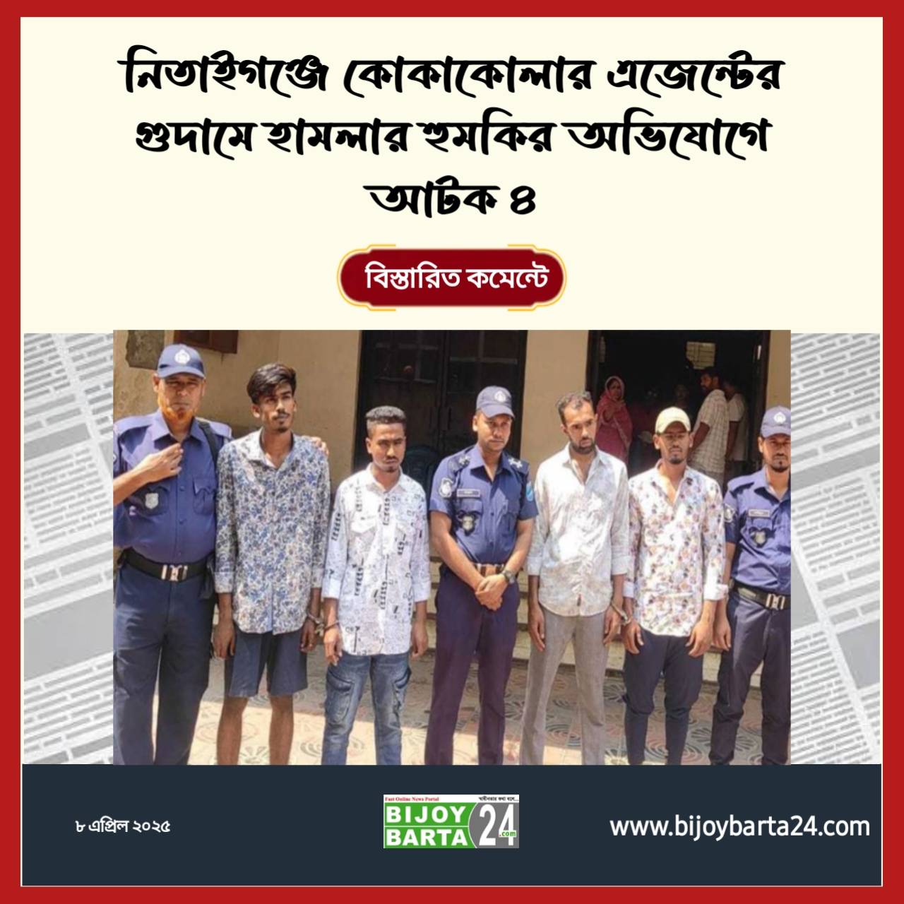 নারায়ণগঞ্জে কোকাকোলার এজেন্টের গুদামে গিয়ে সব ধরনের কোমলপানীয় ধ্বংসের হুমকি প্রদান ও হামলার চেষ্টার অভিযোগে চার যুবককে আটক করেছে পুলিশ।
