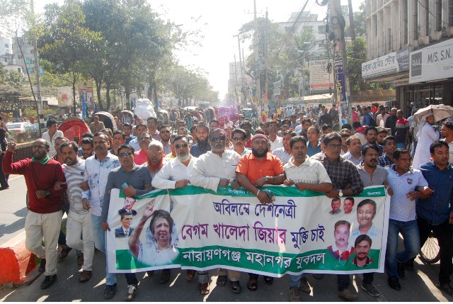 শনিবার দুপুর ১২.০০ টায় নারায়ণগঞ্জ স্কাউট ভবনের সামনে থেকে নারায়ণগঞ্জ মহানগর যুবদলের সভাপতি মাকছুদুল আলম খন্দকার খোরশেদ ও সাধারণ সম্পাদক মমতাজ উদ্দিন মন্তুর নেতৃত্বে দেশনেত্রী বেগম খালেদা জিয়ার মুক্তির দাবীতে মিছিল করে।নগরী প্রদক্ষিন করে বিক্ষোভ মিছিলটি প্রেস ক্লাব প্রাংগনে সমাবেশের মাধ্যমে শেষ হয়।