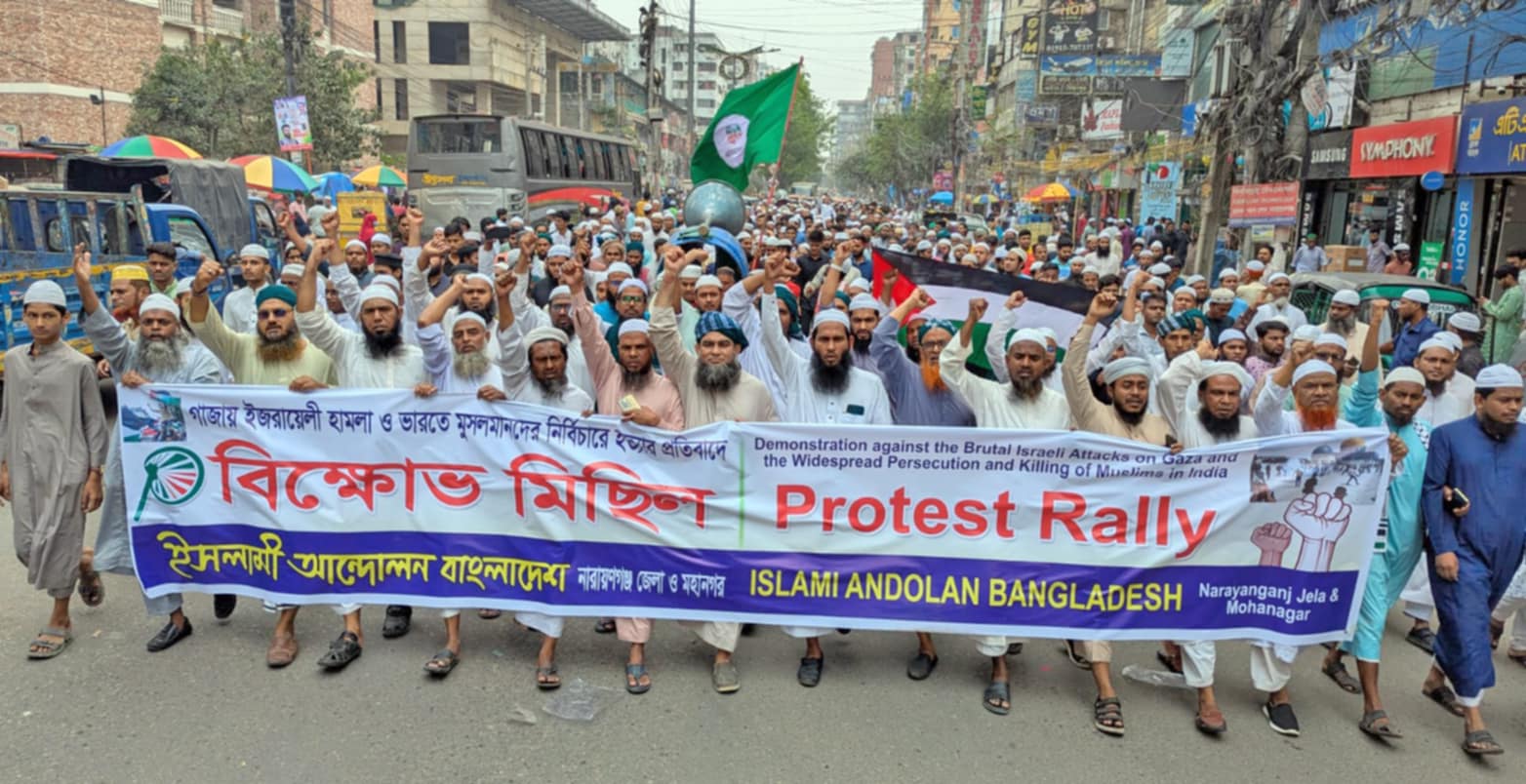 ইসলামী আন্দোলন বাংলাদেশ নারায়ণগঞ্জ জেলা মহানগর এর উদ্যোগে আজ শুক্রবার বাদ জুমআ ডিআইটি চত্বর থেকে গাজায় ইজরাইলী গণহত্যার বিরুদ্ধে বিক্ষোভ মিছিল অনুষ্ঠিত হয়।