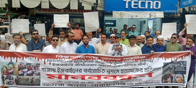 গাজায় ইজরায়েলের বর্বরোচিত নৃশংস হত্যাযজ্ঞের প্রতিবাদে অরাজনৈতিক সামাজিক সংগঠন ‘আমরা জনতা- নারায়ণগঞ্জ’ এর আয়োজনে মানববন্ধন ও প্রতিবাদ সমাবেশ অনুষ্ঠিত হয়।