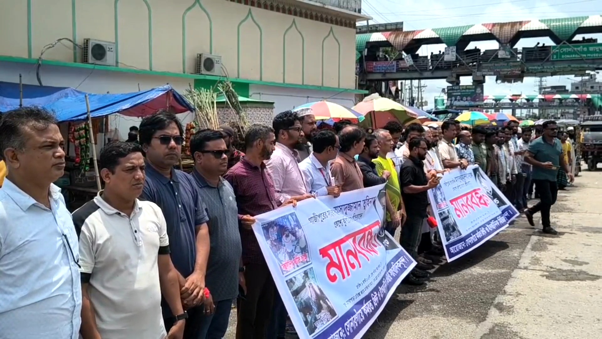 গাজীপুরে প্রকাশ্যে সাংবাদিক আসাদুজ্জামান তুহিনকে কুপিয়ে হত্যার প্রতিবাদে নারায়ণগঞ্জের সোনারগাঁয়ে মানববন্ধন ও বিক্ষোভ মিছিল হয়েছে।