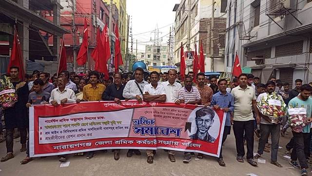 গার্মেন্টস শ্রমিক অভ্যূত্থান দিবস উপলক্ষে নারায়ণগঞ্জ জেলা শ্রমিক কর্মচারী সংগ্রাম পরিষদের দু’দিন ব্যাপী কর্মসূচির প্রথম আজ সকাল ৮ টায় ফতুল্লা বিসিকে শহিদ গার্মেন্টস শ্রমিক আমজাদ হোসেন কামাল স্মরণে শহিদ বেদিতে পুষ্পমাল্য অর্পন, ২ নং গলির গেটের সামনে সমাবেশ ও মিছিল অনুষ্ঠিত হয়। সংগ্রাম পরিষদের সমন্বয়ক হাফিজুল ইসলামের সভাপতিত্বে সমাবেশে বক্তব্য রাখেন সমাজতান্ত্রিক শ্রমিক ফ্রন্ট নারায়ণগঞ্জ জেলার সভাপতি আবু নাঈম খান বিপ্লব, ট্রেড ইউনিয়ন কেন্দ্র জেলার সভাপতি আব্দুল হাই শরীফ, সাধারণ সম্পাদক বিমল কান্তি দাস, বিপ্লবী শ্রমিক সংহতির কেন্দ্রীয় সদস্যসচিব আবু হাসান টিপু, গার্মেন্টস শ্রমিক ফ্রন্ট জেলার সভাপতি সেলিম মাহমুদ, সাধারণ সম্পাদক সাইফুল ইসলাম শরীফ, গার্মেন্টস শ্রমিক সংহতির কেন্দ্রীয় নেতা অঞ্জন দাস, গার্মেন্টস ট্রেড ইউনিয়ন কেন্দ্রের জেলার সাধারণ সম্পাদক ইকবাল হোসেন, বিপ্লবী শ্রমিক সংহতি নারায়ণগঞ্জ জেলার সাধারণ সম্পাদক রাশিদা আক্তার, গার্মেন্টস শ্রমিক সংহতি জেলার সভাপতি কাউসার হামিদ প্রমুখ ।