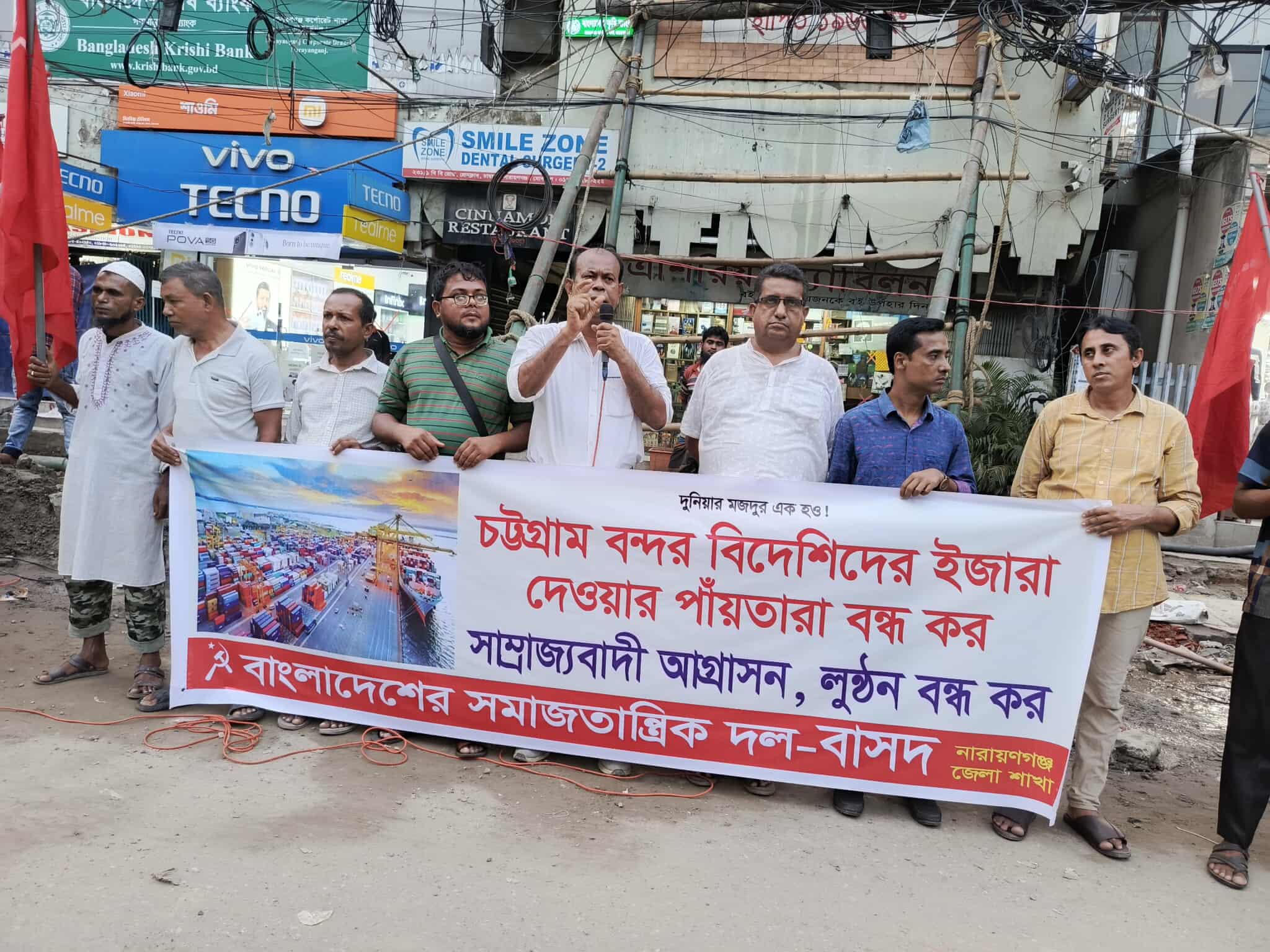 চট্টগ্রাম বন্দর বিদেশিদের ইজারা দেওয়ার পাঁয়তারা বন্ধের দাবিতে বাংলাদেশের সমাজতান্ত্রিক দল-বাসদ নারায়ণগঞ্জ জেলার উদ্যোগে বৃহষ্পতিবার বিকাল ৪ টায় নারায়ণগঞ্জ প্রেস ক্লাবের সামনে মানববন্ধন ও শহরে বিক্ষোভ মিছিল অনুষ্ঠিত হয়। বাসদ নারায়ণগঞ্জ জেলার সদস্যসচিব আবু নাঈম খান বিপ্লবের সভাপতিত্বে সমাবেশে বক্তব্য রাখেন গার্মেন্টস শ্রমিক ফ্রন্ট নারায়ণগঞ্জ জেলার সভাপতি সেলিম মাহমুদ, বাসদ ফতুল্লা থানার সদস্যসচিব এস এম কাদির, গার্মেন্টস শ্রমিক ফ্রন্ট নারায়ণগঞ্জ জেলার সাধারণ সম্পাদক সাইফুল ইসলাম শরীফ।