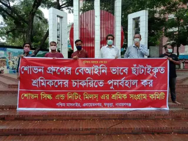 নেতৃবৃন্দ বলেন, শোভন গ্রুপের ২ শতাধিক শ্রমিককে করোনা পরিস্থিতিতে ১ মাস সাধারণ ছুটির পর চাকরিতে যোগদান করতে দেয়া হয়নি। ছাঁটাইকৃত এরা সবাই সিনিয়র শ্রমিক, ২০/২৫ বছর কর্মরত শ্রমিকও এখানে আছে। মালিক কর্তৃপক্ষের সাথে আলোচনা করতে গেলে তারা সমস্যার সমাধান না করে কালক্ষেপন করছে। করোনা পরিস্থিতিতে কর্মহীন হয়ে শ্রমিকরা অনাহারে-অর্ধাহারে পরিবার নিয়ে মানবেতর জীবন যাপন করছে। শ্রমিকরা প্রশাসনে ও বিকেএমইএ-তে লিখিত অভিযোগ দিলেও এখনো কেউ সংকট নিরসনে এগিয়ে আসেনি। নেতৃবৃন্দ অবিলম্বে শ্রমিকদের চাকরিতে পুনর্বহালের দাবি জানান।