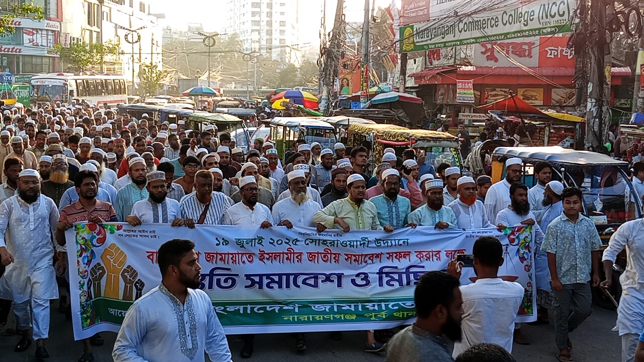 ১৯ শে জুলাই ঢাকা সোহরাওয়ার্দী উদ্যানে জামায়াতের জাতীয় সমাবেশ সফল করার লক্ষ্যে নারায়ণগঞ্জে মহানগরী জামাতের মিছিল অনুষ্ঠিত হয়েছে।