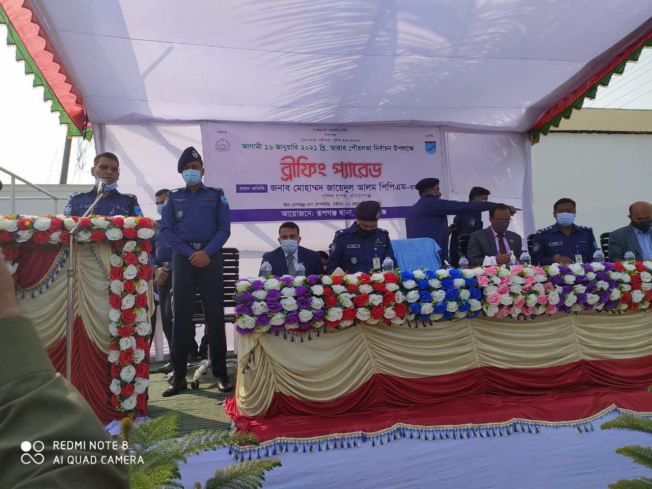 নারায়ণগঞ্জের রুপগঞ্জের তারাব পৌরসভার নির্বাচন পূর্ব ব্রিফিং প্যারেড অনুষ্ঠিত হয়েছে আজ। রূপগঞ্জ থানাধীন তারাব পৌরসভার নির্বাচনে দায়িত্ব পালনকারী অফিসার ও ফোর্সদের এ ব্রিফিং প্যারেডে প্রধান অতিথি হিসেবে উপস্থিত ছিলেন নারায়ণগঞ্জ জেলা পুলিশ সুপার মোহাম্মদ জায়েদুল আলম।এসময় আরো উপস্থিত ছিলেন অতিরিক্ত পুলিশ সুপার (ডিবি) মোঃ জাহেদ পারভেজ চৌধুরী, অতিরিক্ত পুলিশ সুপার (ডিএসবি) মোহাম্মদ শফিউল ইসলাম, সহকারি পুলিশ সুপার (সি সার্কেল) মাহিন ফরাজী। এছাড়াও জেলা নির্বাচন অফিসার ও রিটানিং অফিসার মতিউর রহমান এবং সহকারী রিটানিং অফিসার ও রূপগঞ্জ উপজেলা নির্বাচন অফিসার মোঃ মাহাবুবুর রহমান উপস্থিত ছিলেন। ব্রিফিং প্যারেডে সকলকে সুষ্ঠু ও নিরপেক্ষভাবে নির্বাচনী দায়িত্ব পালনের জন্য বিভিন্ন দিক নির্দেশনা প্রদান করা হয়। উল্লেখ্য আগামীকাল ১৬ জানুয়ারি, ২০২১ তারিখ তারাব পৌরসভার নির্বাচন অনুষ্ঠিত হবে। এ লক্ষ্যে অদ্য ১৫ জানুয়ারি, ২০২১ তারিখ ব্রিফিং প্যারেড শেষে সকল নির্বাচনী কেন্দ্রে দায়িত্ব পালনের জন্য অফিসার ফোর্স মোতায়েন সম্পন্ন হয়েছে। ব্রিফিং প্যারেডে রূপগঞ্জ থানার অফিসার ইনচার্জ জনাব মাহমুদুল হাসান সহ অন্যান্য অফিসার ও ফোর্স উপস্থিত ছিলেন।