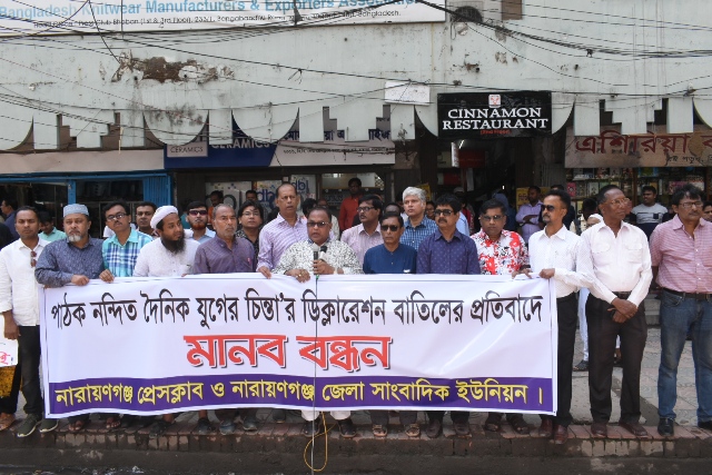 দৈনিক যুগের চিন্তা পত্রিকা’র ডিক্লেয়ারেশন (প্রামাণিকরন) বাতিল করার প্রতিবাদে নারায়ণগঞ্জ প্রেসক্লাব ও সাংবাদিক ইউনিয়নের উদ্যোগে মানব বন্ধন ও স্মারকলিপি প্রদান করা হয়েছে। মঙ্গলবার সকালে নারায়ণগঞ্জ প্রেসক্লাবের সামনে মানব বন্ধন পালন করা হয়। পরে দুপুরে নারায়ণগঞ্জে কর্মরত সাংবাদিকদের নিয়ে নেতৃবৃন্দরা জেলা প্রশাসকের কাছে তথ্য সচিব বরাবর স্মরকলিপি প্রদান করেন।
