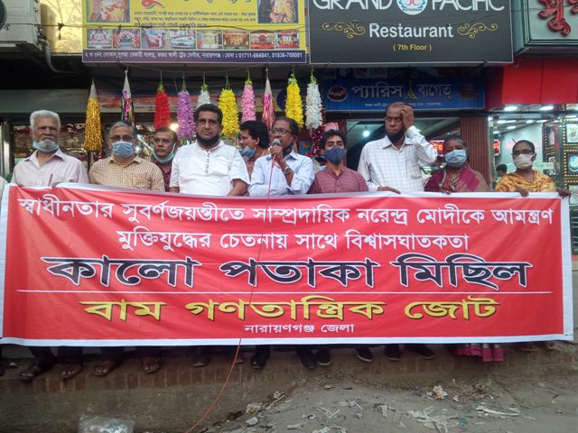 স্বাধীনতার সুবর্ণজয়ন্তীতে ভারতের প্রধানমন্ত্রী নরেন্দ্র মোদীকে আমন্ত্রণ বাাতিলের দাবিতে বাম গণতান্ত্রিক জোট নারায়ণগঞ্জ জেলা দেশব্যাপী কর্মসূচির অংশ হিসাবে আজ বিকাল ৫ টায় ২ নং রেল গেইটে বিক্ষোভ সমাবেশ ও শহরে কালো পতাকা মিছিল অনুষ্ঠিত হয়। বাম গণতান্ত্রিক জোটের নারায়ণগঞ্জ জেলার সমন্বয়ক হাফিজুল ইসলামের সভাপতিত্বে সমাবেশে বক্তব্য রাখেন কমিউনিস্ট পার্টির নারায়ণগঞ্জ জেলার সাধারণ সম্পাদক শিবনাথ চক্রবর্তী, বাসদ জেলা ফোরামের সদস্য আবু নাঈম খান বিপ্লব, বিপ্লবী ওয়ার্কার্স পার্টির জেলার সভাপতি মাহমুদ হোসেন, গণসংহতি আন্দোলনের জেলার সমন্বয়ক তরিকুল সুজন।