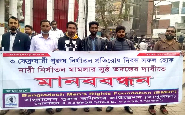 অবশেষে, চেয়ারম্যান সাহেব তাঁর বক্তব্যে বলেন, আজ ০৩ ফেব্রুয়ারি পুরুষ নির্যাতন প্রতিরোধ দিবস। ২০১৬ সালের ৩ ফেব্রুয়ারি জাতীয় প্রেসক্লাবের সামনে প্রথম পুরুষ নির্যাতনের প্রতিবাদে দাঁড়িয়েছিল। আজও একই প্রতিবাদে যখন দাঁড়িয়েছি ততদিনের পুরুষ নির্যাতন অনেক বেড়ে গেছে। নারী নির্যাতন মামলাকে ঢাল হিসেবে ব্যবহার করছে দুষ্ঠু প্রকৃতির নারীরা। পরিকীয়ায় আসক্ত ও অবাধ্য স্ত্রীকে শাসন করতে গেলেই স্বামীর বিরুদ্ধে মিথ্যা নারী নির্যাতন মামলা দিচ্ছে। মামলায় স্বাক্ষী দেওয়া হচ্ছে বাদীর অর্থাৎ স্ত্রীর নিকটাত্মীয়। বর্তমানে নারী নির্যাতন মামলায় জুডিশিয়াল তদন্ত দেওয়া হচ্ছে। তদন্তকারী কর্মকর্তা তার অফিসে সাক্ষীদেরকে ডেকে স্বাক্ষ্য গ্রহণ করে তদন্ত রিপোর্ট দিয়ে দিচ্ছে। বাদীর নিকটাত্মীয়রা স্বাক্ষী থাকায় স্বাক্ষীরা স্বাক্ষ্য প্রদান করে আসামী নির্যাতন করেছে। স্বামীর বিরুদ্ধে গ্রেফতারী পরোয়ানা জারী হয়। স্বামী জানতেই পারে না তার বিরুদ্ধে মামলা হয়েছে। পুলিশের কাছে গ্রেফতার হওয়ার পর সে জানতে পারে তার বিরুদ্ধে নারী নির্যাতন মামলা হয়েছে। নারায়ণগঞ্জের বন্দরে স্বামী-স্ত্রী বিয়ের দাওয়াত খেতে যাচ্ছে। পুলিশ রাস্তায় স্বামীকে গ্রেফতার করেছে স্ত্রীর দায়ের করা নারী নির্যাতন মামলায়। নারী নির্যাতন মামলা জামিন অযোগ্য। এক ভদ্রলোক লন্ডন থাকেন অথচ তার বিরুদ্ধে দেশে নারী নির্যাতন মামলায় গ্রেফতারি পরোয়ানা জারি হয়েছে। আমি দেশের বিবেকবান মানুষের কাছে প্রশ্ন রাখছি কয়েক হাজার কিলোমিটার দূর থেকে স্ত্রীকে কীভাবে নির্যাতন করল ? এখানেই শেষ নয়। আপোষ না হলে নারী নির্যাতন মামলায় জামিন হয়না। বাধ্য হয়েই বাদীর অন্যায় আবদারের কাছে আপোষ করতে হয়। আপোষ না হলে স্বাক্ষ্য গ্রহণের পর আসামীর সাজা হয়ে যায়। আসামী নিজেকে নির্দোষ প্রমান করার সুযোগ থাকে না কারণ স্বাক্ষী থাকে বাদীর নিকটাত্মীয়। স্বাক্ষীদের সবকিছু মুখস্ত করিয়ে দেয়া হয়। তাই দাবী জানাচ্ছি নারী নির্যাতন মামলার সুষ্ঠু তদন্তের জন্য। অপরাধীর সাজা হউক তা আমরাও চাই কিন্তু নিরপরাধ মানুষ যাতে সাজা না পায়। নারী নির্যাতন মামলার তদন্ত সরজমীনে করতে হবে। বাদী এবং আসামী উভয়ের বক্তব্য শুনতে হবে। স্ত্রীর বাপের বাড়ীতে নির্যাতনের ঘটনার স্থান হলে হবে না। নির্যাতনের ঘটনার স্থান হবে শশুর বাড়ীতে। স্বাক্ষী হতে হবে প্রতিবেশীরা। স্বামীর বাড়ী নারায়ণগঞ্জে এবং স্ত্রীর বাপের বাড়ী বগুড়ায়। বগুড়ায় গিয়ে স্ত্রীকে নির্যাতন করেছে। স্বাক্ষী পাঁচজন। আমার প্রশ্ন হলো একজন ব্যক্তি পাঁচজন মানুষের সামনে স্ত্রীকে নির্যাতন করল কীভাবে ? বিএমআরএফ এর ৬নং দাবী সুষ্ঠু তদন্ত ছাড়া গ্রেফতারী পরোয়ানা 