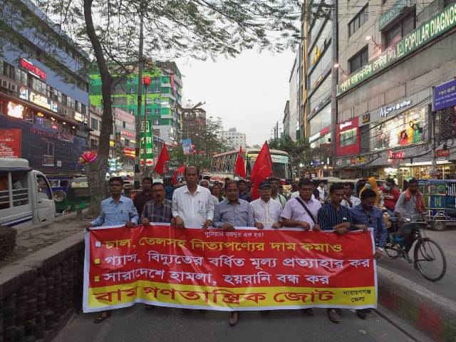 চাল,তেলসহ নিত্যপণ্যের দাম কমানো, গ্যাস- বিদ্যুতের বর্ধিত মূল্য প্রত্যাহার ও সারাদেশে হামলা- হয়রানীর প্রতিবাদে আজ ২৫ ফেব্রæয়ারি ‘২৩ বিকাল ৪:৩০ টায় নারায়ণগঞ্জ প্রেসক্লাবের সামনে সমাবেশ ও মিছিল অনুষ্ঠিত হয়। বাম জোটের সমন্বয়ক ও জেলা সিপিবির সভাপতি হাফিজুল ইসলামের সভাপতিত্বে সমাবেশে বক্তব্য রাখেন বাসদ জেলা কমিটির সদস্য সেলিম মাহমুদ, সিপিবির জেলা সাধারণ সম্পাদক শিবনাথ চক্রবর্তী, বাসদনেতা এস এম কাদির, সাইফুল ইসলাম শরীফ , সিপিবিনেতা আব্দুল হাই শরীফ, ইকবাল হোসেন প্রমুখ। নেতৃবৃন্দ বলেন, বাজারে এমন কোন জিনিস নেই, যার দাম ক্রমাগত বাড়ছে না। বাজার সিন্ডিকেট নিয়ন্ত্রণে সরকার সম্পূর্ণ ব্যর্থতার পরিচয় দিয়েছে। মানুষের আয় বাড়েনি। ফলে তাদের খাবার কমিয়ে দিতে হচ্ছে। শতকরা ৬৮ ভাগ মানুষ খাবার কিনতে হিমশিম খাচ্ছে। উচ্চ দ্রব্যমূল্যের চাপে মানুষ যখন দিশেহারা, তখন আবার নির্বাহী আদেশে সরকার গ্যাস- বিদ্যুতের দাম বাড়িয়েছে। সরকার বলছে, প্রতি মাসে দাম সমন্বয় করা হবে অর্থাৎ দাম বাড়াবে। সরকারের দুর্নীতি, ভুলনীতির দায় জনগন নেবে কেন? শুধুমাত্র গত ১২ বছর ধরে কুইক রেন্টাল বিদ্যুৎ কেন্দ্রগুলোর মালিকদের ক্যাপাসিটি চার্জ বাবদ ৯৬ হাজার কোটি টাকা দেয়া হয়েছে। আজ সেটার দায় জনগনের উপর চাপিয়ে দেয়া হচ্ছে। এটি কোনভাবে মেনে নেয়া যায় না। নেতৃবৃন্দ আরো বলেন, সরকারের চরম ফ্যাসিবাদী দু:শাসনে মানুষের জীবন দুর্বিসহ। সভা- সমাবেশে বাধা, হামলা স্বাভাবিক বিষয় হয়ে দাঁড়িয়েছে। ডিজিটাল নিরাপত্তা আইন নামক কালো আইনে বিরোধী মত-পথ দমন করা হচ্ছে। দেশটাকে পুলিশী রাষ্ট্রে পরিনত করা হয়েছে। নেতৃবৃন্দ ফ্যাসিবাদী দু:শাসন হটাতে রাজপথে লড়াই জোরদার করার জন্য জনগনের প্রতি উদাত্ত আহŸান জানান।