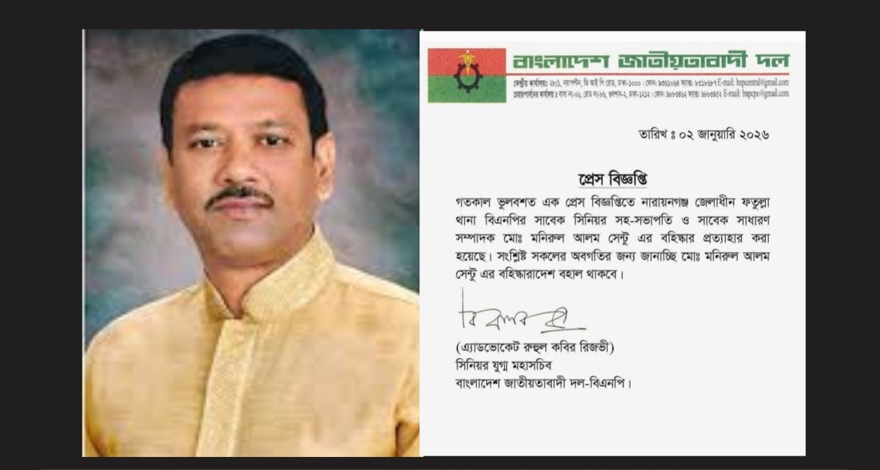 চিঠিতে উল্লেখ করা হয়, ভুলবশত এক প্রেস বিজ্ঞপ্তিতে ফতুল্লা থানা বিএনপির সাবেক সিনিয়র সহসভাপতি মনিরুল আলম সেন্টুর বহিষ্কারাদেশ প্রত্যাহার করা হয়েছে। সংশ্লিষ্ট সবাইকে জানানো হচ্ছে—মো. মনিরুল আলম সেন্টুর বহিষ্কারাদেশ বহাল থাকবে।