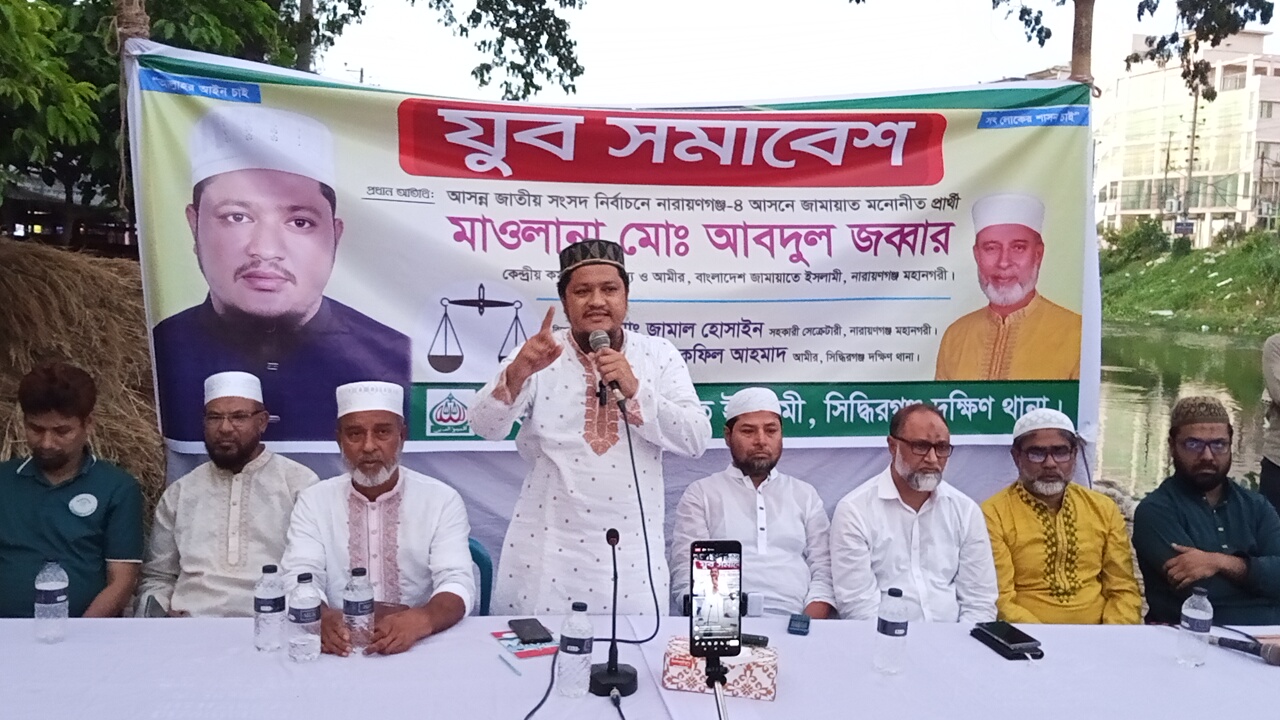 সমাবেশে প্রধান অতিথির বক্তব্য রাখেন- নারায়ণগঞ্জ মহানগরী জামায়াতে ইসলামীর আমীর ও নারায়ণগঞ্জ ৪ আসনের সংসদ সদস্য প্রার্থী মাওলানা মুহাম্মদ আবদুল জব্বার। এসময় তিনি বলেন আমাদের দেশে এক শ্রেনীর রাজনৈতিক নেতৃবৃন্দ যুবকদের ঘাম, রক্ত ব্যবহার করে ক্ষমতায় আসেন, পরে যুবকদের ত্যাগের কথা ভুলে গিয়ে ক্ষমতার নেশায় মানুষরূপী ডাইনি হয়ে বসেন। সকল সরকারই বলেন শিক্ষিত বেকার আর থাকবেনা। ঘরে ঘরে চাকুরী দিবো। অথচ স্বাধীনতার ৫৩ বছর পার হলেও আজ পর্যন্ত কোন সরকারই তা বাস্তবায়ন করতে পারেনাই। আমরা বলবো ইসলামী সরকার ক্ষমতায় গেলে আল্লাহর আইন বাস্থবায়ন হলে সমাজে আর কোন বৈষম্য থাকবেনা। সকলেই তার যোগ্যতা অনুযায়ী চাকুরী পাবে ইনশাআল্লাহ। তিনি আরো বলেন ন্যায় ও ইনসাফ ভিত্তিক কল্যাণ রাষ্ট্র প্রতিষ্ঠার জন্য সৎ ও যোগ্য নেতৃত্বের বিকল্প নেই। তাই বলবো আগামীর কল্যান রাষ্ট্র বির্নিমার্নে যুবকদেরকেই এগিয়ে আসতে হবে।