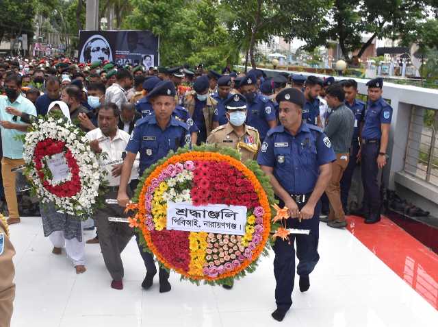 উক্ত শোক দিবস উপলক্ষে সকাল ১০ টায় নারায়ণগঞ্জ জেলা প্রশাসকের কার্যালয়ের সামনে ‘বঙ্গবন্ধুর প্রতিকৃতি’ তে বিভিন্ন সামাজিক এবং রাজনৈতিক সংঘঠনের পাশাপাশি পিবিআই নারায়ণগঞ্জ জেলার পুলিশ সুপার মোহাম্মদ মনিরুল ইসলাম, নেতৃত্বে অত্র ইউনিটের সকল অফিসার ও ফোর্স স্ব-শরীরে হাজির হয়ে জাতির পিতাসহ ১৫ই আগস্টে নিহত সকল শহীদদের স্বরণে যথাযথ সম্মান এবং শ্রদ্ধার মধ্যে দিয়ে পুস্পস্তবক অর্পণ করা হয়। পুস্পস্তবক অর্পণ শেষে পুলিশ সুপার অত্র কার্যালয়ে জাতির জনকের জীবন ও কর্মের উপর আলোকপাত করেন। এছাড়াও জাতির পিতাসহ তার পরিবার এবং ১৫ই আগস্টে নিহত সকল শহিদের রুহের মাগফেরাত ও কল্যান কামানা করে বিশেষ দোয়া ও মিলাদ মাহফিল অনুষ্টিত হয়। উক্ত অনুষ্ঠান শেষে অত্র অফিসের সকল অফিসার ও ফোর্সদের জন্য বিশেষ খাবারের আয়োজন করা হয়।