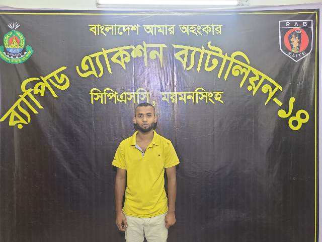 কেময়মনসিংহ জেলার ভালুকা থানাধীন মল্লিক বাড়ি ইউনিয়নের ধামশুর এলাকা থেকে তাকে গ্রেপ্তার করা হয়।