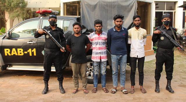 গ্রেফতারকৃতরা হলেন, ১। মোঃ বিল্লাল হোসেন (২১), পিতা-আবু পাটোয়ারী, মাতা-জয়গুন বিবি, সাং-চতলার বাজার, থানা-লাল মোহন, জেলা-ভোলা, এ/পি- পাগলা (মামুনের বাড়ীর ভাড়াটিয়া), থানা-ফতুল্লা, জেলা-নারায়ণগঞ্জ, ২। মোঃ শেখ মিসাল (১৯), পিতা-মোঃ আফজাল, মাতা-মাহেনুর বেগম, সাং-রাজেন্দ্রপুর, থানা-কেরানীগঞ্জ, জেলা-ঢাকা, এ/পি-আলিগঞ্জ কুতুবপুর, থানা-ফতুল্লা, জেলা-নারায়ণগঞ্জ, ৩। মোঃ রাকিব (২২), পিতা-নুর ইসলাম, মাতা-আলেয়া বেগম, সাং-১১নং কালিয়া, থানা-বাকেরগঞ্জ, জেলা-বরিশাল, এ/পি- আলীগঞ্জ (নুর ইসলাম মেম্বারের বাড়ীর ভাড়াটিয়া), থানা-ফতুল্লা, জেলা-নারায়ণগঞ্জ এবং ৪। মোঃ সুমন (২২), পিতা-মোঃ আরব আলী মিয়া, মাতা-রিনা বেগম, গ্রাম-আলিগঞ্জ, কতুবপুর ইউনিয়ন, থানা-ফতুল্লা, জেলা-নারায়ণগঞ্জ’দেরকে নারায়ণগঞ্জ জেলার ফতুল্লা মডেল থানাধীন পাগলা বাজার এলাকা থেকে বিভিন্ন ধরনের গাড়ী চালকদের কাছ থেকে চাঁদাবাজির সময় চাঁদাবাজির টাকা সহ হাতেনাতে গ্রেফতার করে। বিষয়টি নিশ্চিত করেছেন র্যাব-১১ এক সংবাদ বিজ্ঞপ্তিতে জানানা।