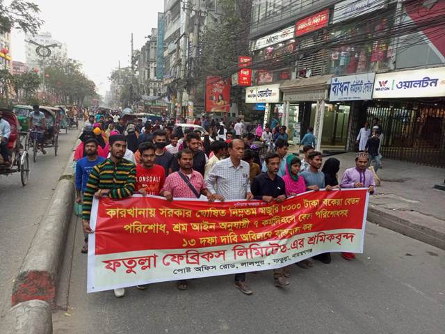 নিম্নতম মজুরি ৮০০০ টাকা, বকেয়া মজুরি পরিশোধ, শ্রম আইন অনুযায়ী ৭ কর্মদিবসে বেতন পরিশোধসহ ১৩ দফা বাস্তবায়নের দাবিতে আজ ১৯ ফেব্রুয়ারি ‘২০২৩, রবিবার, বিকাল সাড়ে ৪ টায় নারায়ণগঞ্জ প্রেসক্লাবের সামনে বিক্ষোভ সমাবেশ ও জেলা শহরে মিছিল করে ফতুল্লা থানার লালপুরে অবস্হিত ফতুল্লা ফেব্রিকস লিমিটেড এর শ্রমিকেরা। গার্মেন্টস শ্রমিক ইব্রাহিমের সভাপতিত্বে বক্তব্য রাখেন গার্মেন্টস শ্রমিক ফ্রন্ট নারায়ণগঞ্জ জেলা সভাপতি শ্রমিক জননেতা সেলিম মাহমুদ, সাধারণ সম্পাদক সাইফুল ইসলাম শরীফ, সিদ্ধিরগঞ্জ থানার সভাপতি রুহুল আমিন সোহাগ, কাঁচপুর শিল্পাঞ্চল শাখার সহ-সভাপতি আনোয়ার খান, কারখানার শ্রমিক রায়হান, নাঈম, মাসুদ রানা। নেতৃবৃন্দ বলেন : গার্মেন্টস মালিক কর্তৃপক্ষ বাংলাদেশ সরকার ঘোষিত ২০১৮ সালের প্রায় সাড়ে চার বছর পূর্বে নিম্নতম মজুরি এখনো পর্যন্ত বাস্তবায়ন করে নাই।শ্রম আইন অনুযায়ী নিয়মিত প্রতিমাসে সাত কর্ম দিবসে বেতন পরিশোধ করে না। স্ব-বেতনে মাতৃত্বকালীন সুবিধা নারী শ্রমিকদের প্রদান করে না।বছর শেষ হলে অর্জিত ছুটির টাকা পরিশোধ করে না । এই গার্মেন্টস এর মালিক কর্তৃপক্ষ বাংলাদেশ সরকারের শ্রম আইন অনুযায়ী অনুসরণ না কারখানা পরিচালনা একেবারেই করেনা । নেতৃবৃন্দ আরো বলেন : কারখানার সকল শ্রমিকদের নিয়োগ পত্র – পরিচয় পত্র- সার্ভিস বুক প্রদান করেনা মালিক কর্তৃপক্ষ। না কারখানার নারী শ্রমিকদের রাত্রিকালীন ডিউটি অতিরিক্ত করায়। কারখানায় কোন শ্রমিক অসুস্থ হলে ছুটি দেয় না এবং নিয়মমাফিক শ্রমিকরা ছুটি কাটাতে চাইলে মালিক কর্তৃপক্ষ ছুটি প্রদান করে না। গত তিন বছর যাবৎ শ্রমিকের ইনক্রিমেন্ট বৃদ্ধি করে নাই। মালিক কর্তৃপক্ষ বেআইনিভাবে যখন তখন যেকোনো সময় শ্রমিক ছাঁটাই করে শ্রমিকের অধিকার বঞ্চিত করে। শ্রমিকেরা তাদের সংকট নিরসনের জন্য মালিক কর্তৃপক্ষ বরাবর বিভিন্নভাবে অভিযোগ জানিয়েছে তারপরও মালিক কর্তৃপক্ষ সংকট সমাধান করে না। এই মালিক প্রতিমাসের ২০ থেকে ২২ তারিখে শ্রমিকের বেতন পরিশোধ করে। শ্রমিকেরা বাধ্য হয়ে আন্দোলন সংগ্রাম করে নিয়মতান্ত্রিকভাবে। নেতৃবৃন্দ আরো বলেন : বর্তমানে বাংলাদেশে সকল নিত্যপণ্যের দাম বহুগুণ বেড়ে যাওয়ায় শ্রমিকের বেচে থাকা কষ্ট সাধ্য হয়ে গেছে। তাই সরকার, প্রশাসন এবং শ্রমদপ্তরের কর্মকর্তাদের কাছে আহবান জানান অবিলম্বে শ্রমিকদের সংকট দ্রুত নিরসনের জন্য বকেয়া মজুরি পরিশোধ সহ ১৩ দফা দাবি বাস্তবায়ন করার আহবান জানান। দাবি আদায় না হলে কারখানার শ্রমিকেরা লাগাতার আন্দোলন সংগ্রাম করবে।