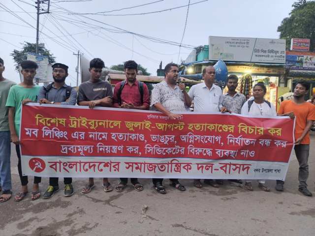 নিত্যপণ্যের দাম কমানো এবং মব লিঞ্চিং করে বিচার বহির্ভূত হত্যাকাÐ বন্ধের দাবিতে বাংলাদেশের সমাজতান্ত্রিক দল-বাসদ বন্দর উপজেলা শাখার উদ্যোগে আজ ২৭ সেপ্টেম্বর ২০২৪ বিকাল ৫ টায বন্দর ঘাটে সমাবেশ অনুষ্ঠিত হয়। বাসদ উপজেলার সংগঠক মুুন্নি সরদারের সভাপতিত্বে সমাবেশে বক্তব্য রাখেন বাসদ নারায়ণগঞ্জ জেলার সদস্যসচিব আবু নাঈম খান বিপ্লব, গার্মেন্টস শ্রমিক ফ্রন্ট নারায়ণগঞ্জ জেলার সভাপতি সেলিম মাহমুদ, সমাজতান্ত্রিক ছাত্র ফ্রন্ট নারায়ণগঞ্জ জেলার আহŸায়ক সাইফুল ইসলাম, পারভেজ, মাহবুব ইসলাম, খোকন।