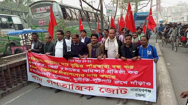 বিদ্যুতের মূল্য বৃদ্ধির পাঁয়তারা বন্ধ, নিত্যপণ্যের দাম কমানো, ভোট ও ভাতের অধিকার নিশ্চিত করার দাবিতে আজ বিকাল ৪ টায় বাম গণতান্ত্রিক জোট নারায়ণগঞ্জ জেলা শাখার উদ্যোগে নারায়ণগঞ্জ কেন্দ্রীয় শহিদ মিনারে সমাবেশ ও শহরে বিক্ষোভ মিছিল অনুষ্ঠিত হয়। বাম জোটের সমন্বয়ক হাফিজুল ইসলামের সভাপতিত্বে সমাবেশে বক্তব্য রাখেন কমিউনিস্ট পার্টির সাধারণ সম্পাদক শিবনাথ চক্রবর্তী, বাংলাদেশের সমাজতান্ত্রিক দল-বাসদ নারায়ণগঞ্জ জেলার সদস্যসচিব আবুু নাঈম খান বিপ্লব, বাসদ নারায়ণগঞ্জ জেলা কমিটির সদস্য সেলিম মাহমুদ, সিপিবির নেতা বিমল কান্তি দাস, বাসদ নেতা সাইফুল ইসলাম শরীফ,।