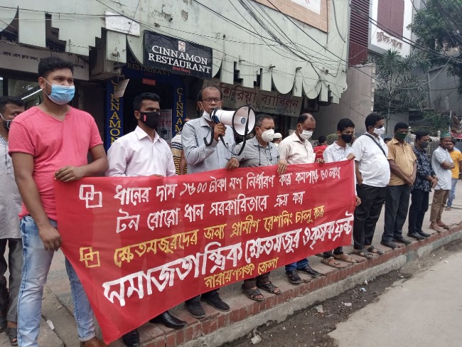 নেতৃবৃন্দ বলেন, এ সময় বোরো ধানের মৌসুম চলছে। কৃষকরা বিভিন্ন এনজিও ও কৃষি ব্যাংক থেকে লোন নিয়ে ফসল ফলিয়েছে। ফলে তারা ধান বিক্রি করে ঋণের টাকা পরিশোধ করে। কিন্তু তাদের উৎপাদন খরচের কম দামে বাজারে ধান বিক্রি করতে হচ্ছে। আমরা সরকারের কাছে মণ প্রতি ১৫০০ টাকা ধানের দাম নির্ধারণের দাবি জানাই। এবার সরকার সাড়ে ১১ লাখ টন চাল ও সাড়ে ৬লাখ টন ধান ক্রয় করার সিদ্ধান্ত করে। প্রথমত এটি একেবারে অপ্রতুল। কমপক্ষে ৫০ লাখ টন ধান ক্রয় করা দরকার। মিল মালিকদের স্বার্থে ধানের থেকে বেশী চাল সংগ্রহের সিদ্ধান্ত নিয়েছে। প্রতি ইউনিয়নে ক্রয়কেন্দ্র না থাকায় খোদ কৃষকরা গুদামে ধান বিক্রি করতে পারছে না। কৃষকদের থেকে কম দামে ধান কিনে সরকার নির্ধারিত দামে গুদামে ধান দিচ্ছে সরকারি দলের লোকেরা । শুধু তাই নয়, গ্রামীণ ক্ষেতমজুরদের সারা বছর কাজ নেই। ফলে প্রায় ৭ মাস তাদের খুবই কষ্টে চলতে হয়। আর্মি, পুলিশ রেশন পায় অথচ গ্রামীণ ক্ষেতমজুররা রেশন পায় না। নেতৃবৃন্দ সার, বীজসহ কৃষি উপকরণের দাম কমানোসহ কৃষি-কৃষক ও দেশ বাঁচানোর জন্য সরকারের প্রতি আহবান জানান।