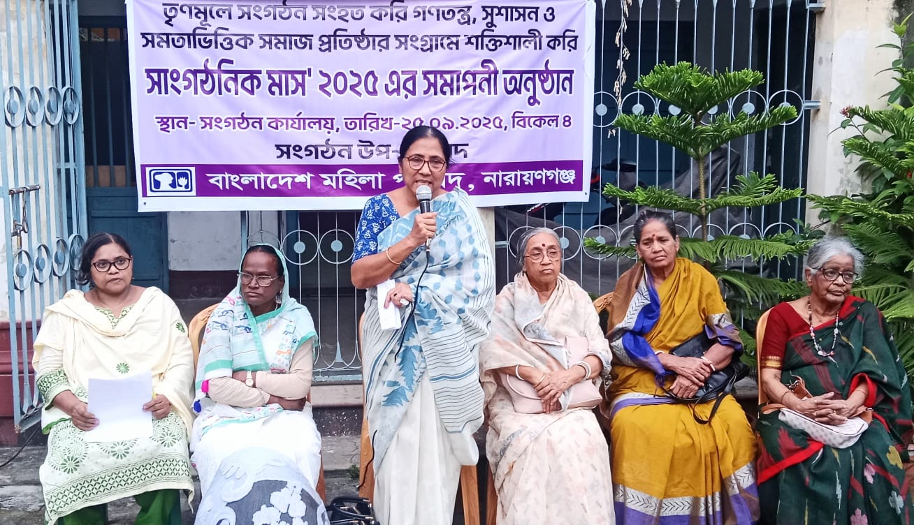বাংলাদেশ মহিলা পরিষদ, নারায়ণগঞ্জ জেলার সংগঠন উপ-পরিষদের উদ্যোগে “তৃণমূলে সংগঠন সংহত করি: গণতন্ত্র, সুশাসন ও সমতাভিত্তিক সমাজ প্রতিষ্ঠার সংগ্রাম শক্তিশালী করি” -এই শ্লোগানকে সামনে রেখে সাংগঠনিক মাস ২০২৫ এর সমাপনী অনুষ্ঠান করা হয়।