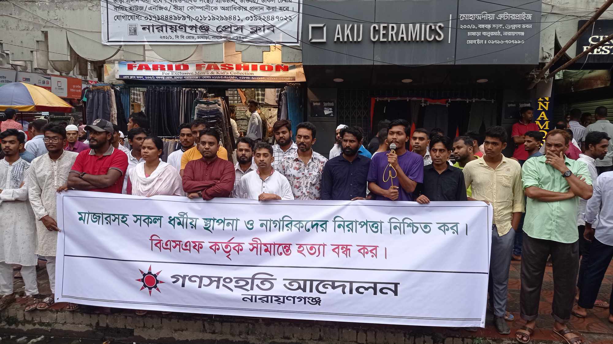মাজারে হামলা নাগরিক নিরাপত্তা ও সীমান্তে হত্যার প্রতিবাদে নারায়ণগঞ্জে গণসংহতি আন্দোলনের বিক্ষোভ সমাবেশ অনুষ্ঠিত হয়েছে। শুক্রবার বিকালে নারায়ণগঞ্জ প্রেসক্লাবের সামনে এ বিক্ষোভ সমাবেশ অনুষ্ঠিত হয়।