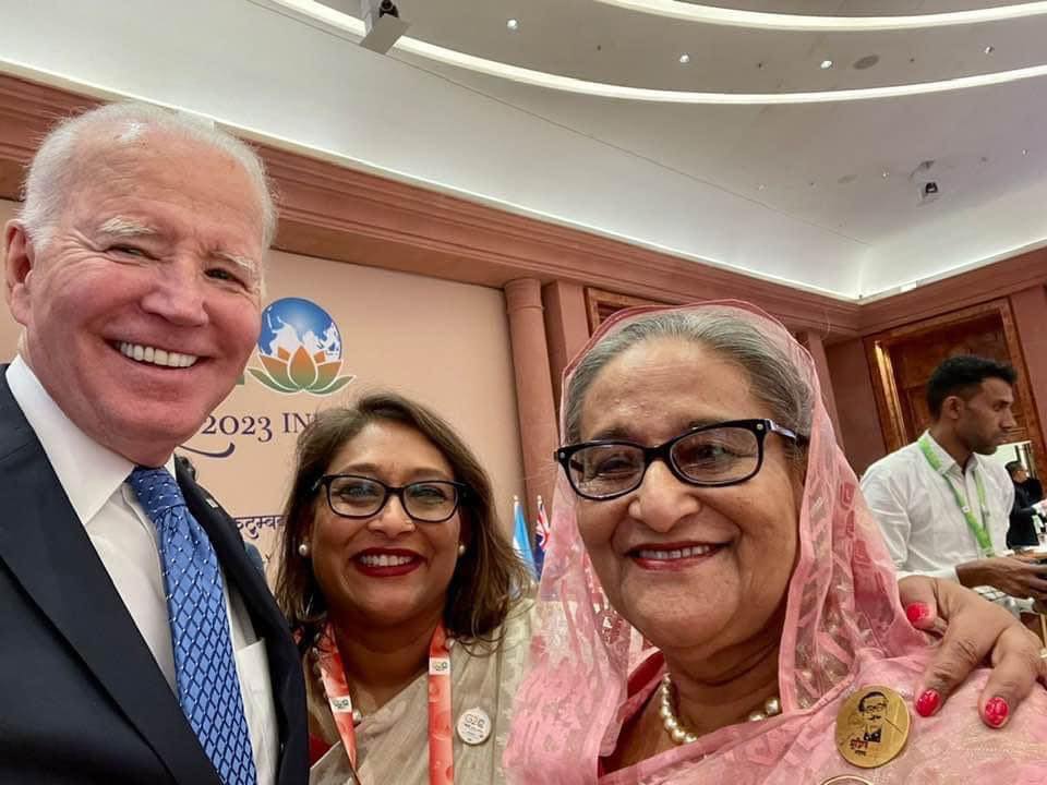 বাইডেনকে শেখ হাসিনা ও তার মেয়ের সঙ্গে নিজের মোবাইল ফোন ব্যবহার করে সেলফি তুলতে দেখা গেছে।