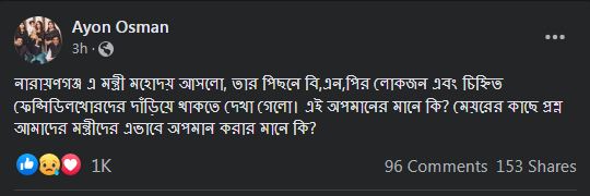 এসময় নারায়ণগঞ্জ সিটি করপোরেশনের মেয়র সেলিনা হায়াৎ আইভীর কাছে প্রশ্ন তুলে তিনি বলেন, নারায়ণগঞ্জ এ মন্ত্রী মহোদয় আসলো, তার পিছনে বিএনপির লোকজন এবং চিহ্নিত ফেন্সিডিলখোরদের দাঁড়িয়ে থাকতে দেখা গেলো। এই অপমানের মানে কি? মেয়রের কাছে প্রশ্ন মন্ত্রীদের এভাবে অপমান করার মানে কি?