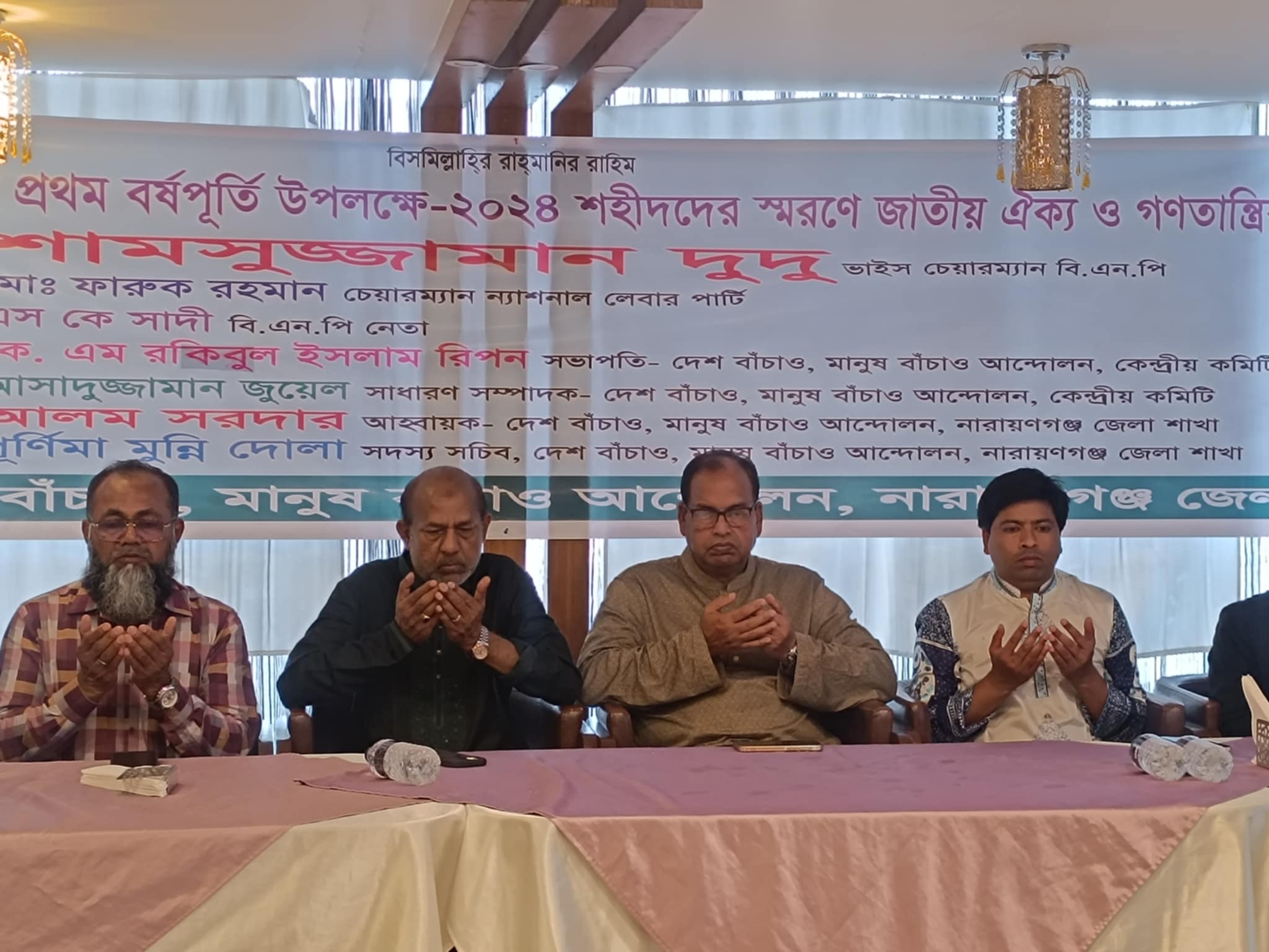 দেশ বাঁচাও মানুষ বাঁচাও আন্দোলনের নারায়ণগঞ্জ জেলা শাখার আহ্বায়ক আলম সরদারের সভাপতিতে এই অনুষ্ঠানে বিশেষ অতিথি হিসেবে উপস্থিত ছিলেন ন্যাশনাল লেবার পার্টির চেয়ারম্যান মো. ফারুক রহমান, বিএনপি নেতা এসকে সাদী, দেশ বাঁচাও মানুষ বাঁচাও আন্দোলনের কেন্দ্রীয় কমিটির সভাপতি কে. এম রকিবুল ইসলাম রিপন, সাধারণ সম্পাদক আসাদুজ্জামান জুয়েল, নারায়ণগঞ্জ মহানগর বিএনপির সদস্য সচিব আবু আল ইউসুফ খান টিপু।