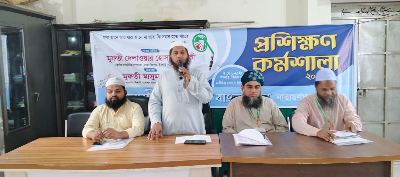 আজ ৩ মে শনিবার সকাল ১০টায় কদমতলী কারীমিয়া মাদরাসা মিলনায়তনে ইসলামী আন্দোলন বাংলাদেশ নারায়ণগঞ্জ মহানগর সভাপতি মুফতি মাসুম বিল্লাহর সভাপতিত্বে ও প্রশিক্ষণ সম্পাদক মুহা. মেহেদী হাসানের সঞ্চালনায় প্রশিক্ষণ কর্মশালায় প্রধান অতিথির বক্তব্যে তিনি উপর্যুক্ত কথা বলেন।