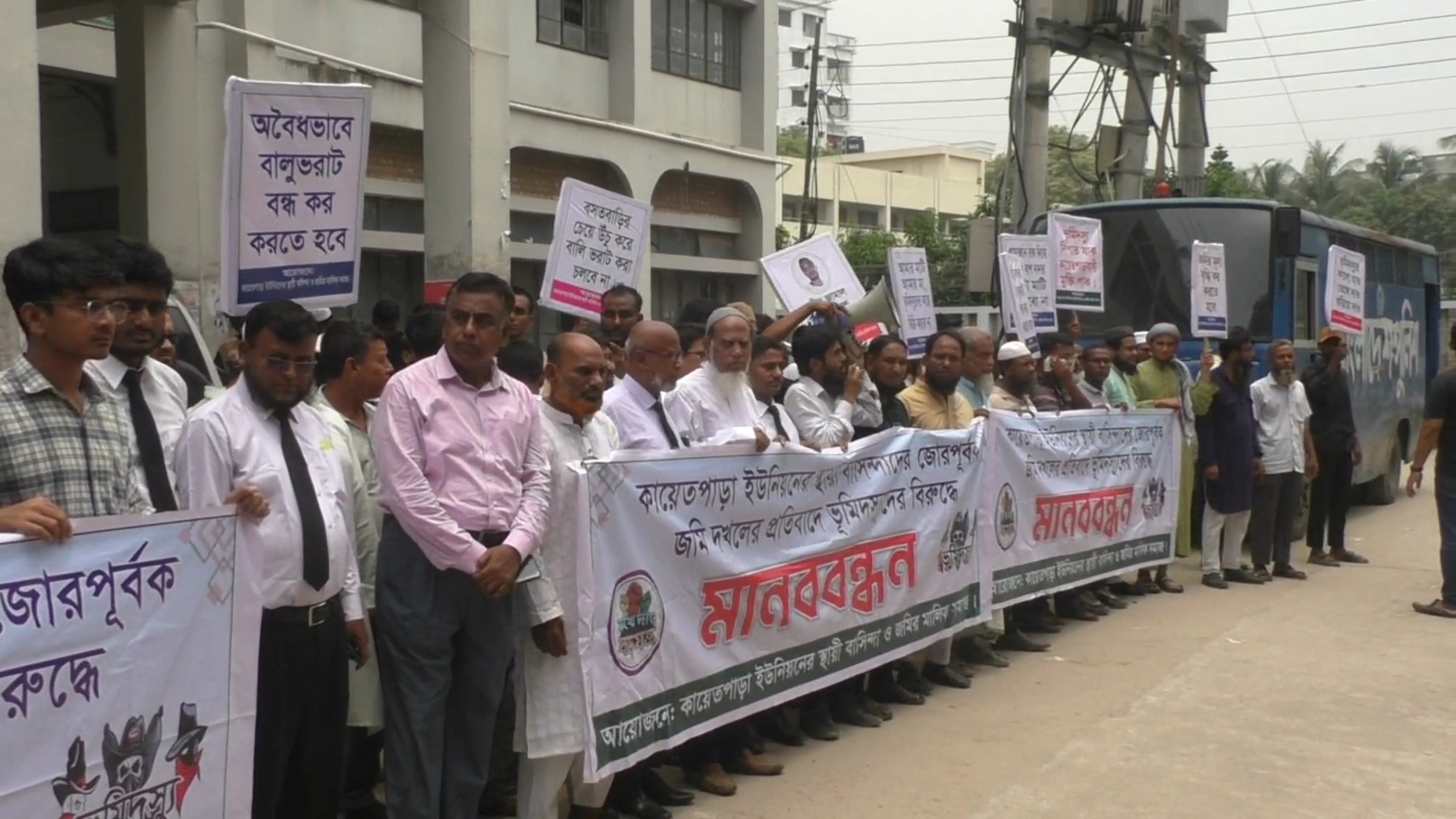 এসময় বক্তারা বলেন, রুপগঞ্জের কায়েতপাড়ার প্রায় ৮ হাজার হেক্টর জমি ভূমিদস্যুরা অবৈধভাবে বালু ভরাটের মাধ্যমে দখল করেছে। আমারা কায়েতপাড়াবাসী আমাদের কৃষিজমি ও নিজদের জমি রক্ষার্থে ৯ দফা দাবিতে এখানে মানববন্ধন করছি। কায়েতপাড়া ইউনিয়ন পরিষদের বাসিন্দাদের জমি ক্রয় না করে সম্পূর্ন বেআইনী ও অবৈধভাবে ড্রেজার দিয়ে বালু ফেলে ফসলী জমি, খেলার মাঠ, রাস্তাঘাট ভরাট করে ফেলার বিরুদ্ধে কার্যকরী পদক্ষেপ গ্রহণের জন্য জেলা প্রশাসকের কাছে স্মারকলিপি প্রদান করেছি।