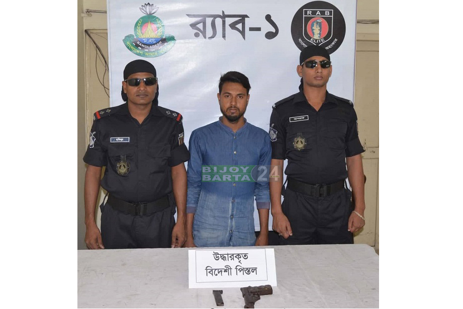 পিস্তল ও ম্যাগজিনসহ হত্যা মামলার আসামী আটক রূপগঞ্জ (নারায়ণগঞ্জ) প্রতিনিধিঃ রূপগঞ্জের চনপাড়া এলাকা থেকে অভিযান চালিয়ে পিস্তল ও ম্যাগজিনসহ হত্যা মামলার আসামী মিল্লাত হোসেন ভূইয়া (২৫) নামে আটক করেছে র্যাব-১ এর সিপিসি ৩। শনিবার সকালে উপজেলার চনপাড়া পূণর্বাসন কেন্দ্র এলাকায় ডেমরা কালীগঞ্জ সড়কে সন্দেহভাজন হিসেবে তার সঙ্গে থাকা ব্যাগ তল্লাশি করে এ অস্ত্র উদ্ধার করে র্যাব। মিল্লাত হোসেন ভুইয়া চনপাড়া এলাকার আবু সাইদের ছেলে। র্যাব-১ এর সিপিসি-৩ এর সহকারী পুলিশ সুপার সুজয় সরকার গ্রেফতারকৃত মিল্লাত হোসেনের জবানবন্দির বরাত দিয়ে বলেন, সে আলোচিত মনির হত্যাকান্ডের এজাহারভুক্ত আসামি। এছাড়া এলাকায় মাদকসহ সন্ত্রাসী কর্মকান্ডে জড়িত ছিলো।