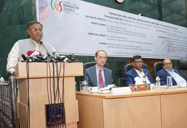 তথ্য ও সম্প্রচারমন্ত্রী এবং আওয়ামী লীগের যুগ্ম সাধারণ সম্পাদক ড. হাছান মাহমুদ বলেছেন, রোহিঙ্গাদের অধিকার ও সম্মানসহ মিয়ানমারে ফেরাই একমাত্র সমাধান। রোহিঙ্গা উদ্বাস্তু একটি মানবিক সমস্যা এবং এর সমাধান হওয়া জরুরি উল্লেখ করে তিনি বলেন, ‘আমরা মনে করি, রোহিঙ্গাদের সমস্ত নাগরিক অধিকার দিয়ে, সম্মান বজায় রেখে তাদের নিজ দেশ মিয়ানমারে ফিরিয়ে নিয়ে যাওয়াই একমাত্র সমাধান। ’ তবে এক্ষেত্রে আন্তর্জাতিক সম্প্রদায় থেকে মিয়ানমারের ওপরে যে চাপ প্রয়োগ করা প্রয়োজন, সেটি লক্ষ্য করা যাচ্ছে না জানিয়ে মন্ত্রী বলেন, ‘এখানে চীনের ভূমিকা অত্যন্ত গুরুত্বপূর্ণ। একইসাথে ভারতের সাথেও আমরা আলাপ আলোচনা করেছি। তারাও মিয়ানমারকে বোঝানোর চেষ্টা করছে। আশা করছি সমাধান হবে।’ তথ্যমন্ত্রী আজ দুপুরে রাজধানীতে ঢাকা বিশ্ববিদ্যালয়ের(ঢাবি) সিনেট ভবন মিলনায়তনে ‘গণহত্যা ও বিচার : রোহিঙ্গা সংকটে বাংলাদেশের অবস্থান’ (জেনোসাইড এন্ড জাস্টিস : বাংলাদেশ’স রেসপন্স টু রোহিঙ্গা ক্রাইসিস) সেমিনারে প্রধান অতিথির বক্তৃতায় এসব কথা বলেন।
