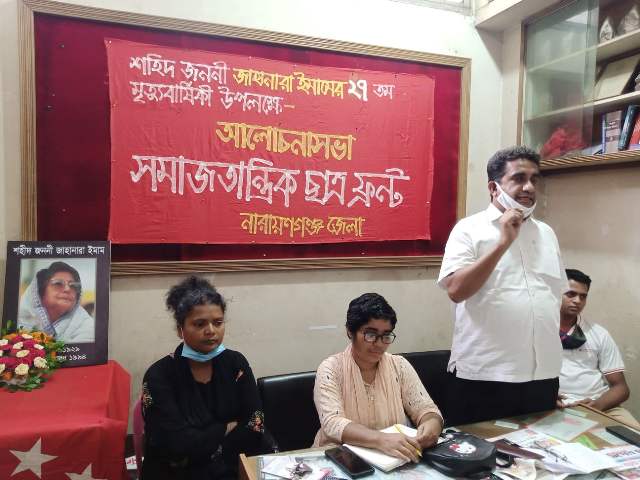 শহীদ জননী জাহানারা ইমামের ২৭ তম মৃত্যুবার্ষিকী উপলক্ষে সমাজতান্ত্রিক ছাত্র ফ্রন্ট নারায়ণগঞ্জ জেলা শাখার উদ্যোগে আজ সকাল ১১টায় ২নং রেলগেট¯হ বাসদ জেলা কার্যালয়ে আলোচনাসভা অনুষ্ঠিত হয়। সমাজতান্ত্রিক ছাত্র ফ্রন্ট নারায়ণগঞ্জ জেলার সভাপতি সুলতানা আক্তারের সভাপতিত্বে সভায় বক্তব্য রাখেন বাসদ নারায়ণগঞ্জ জেলা ফোরামের সদস্য আবু নাঈম খান বিপ্লব, সমাজতান্ত্রিক ছাত্র ফ্রন্ট জেলার সাংগঠনিক সম্পাদক শফিকুল ইসলাম শিমুল, অর্থ সম্পাদক মুন্নি সর্রদার, সমাজতান্ত্রিক ছাত্র ফ্রন্টের সদস্য রিনা আক্তার, সাইফুল ইসলাম প্রমুখ । আলোচনার পূর্বে শহীদ জননী জাহানারা ইমামের প্রতিকৃতিতে পুষ্পার্পন করেন সমাজতান্ত্রিক ছাত্র ফ্রন্টের নেতৃবৃন্দ।