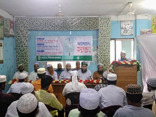 নগর সভাপতি আলতাফ হোসেন গাজীর সভাপতিত্বে এবং সেক্রেটারী আমীর হোসেন এর পরিচালনায় “শিক্ষার মানোন্নয়ন,বৈষম্য দূরীকরণ,শিক্ষাব্যবস্থা জাতীয়করণ ও শিক্ষক সমাজের ন্যায্য দাবী” আদায়ের লক্ষ্যে আয়োজিত আলোচনা সভায় বিশেষ অতিথির বক্তব্যে ইসলামী আন্দোলন বাংলাদেশ নারায়ণগঞ্জ মহানগর সভাপতি মুফতী মাসুম বিল্লাহ বলেন,একই সিলেবাস পড়িয়েও সরকারি- বেসরকারি শিক্ষকদের বেতন,বাড়ি ভাড়া,বোনাস ও চিকিৎসা ভাতায় আকাশ-পাতাল ব্যবধান মেনে নেওয়া যায় না। এই বৈষম্য দূর করতে জাতীয়করণের কোন বিকল্প নেই। এছাড়াও এনটিআরসিএ’র মাধ্যমে দেশের একপ্রান্তের শিক্ষকদের আরেক প্রান্তে নিয়োগ প্রদান করায় এবং আর্থিক সুবিধা কম থাকায় মেধাবীরা শিক্ষকতা পেশায় আগ্রহ হারাচ্ছে। সমস্যার সমাধানে দ্রুত বদলী সিস্টেম চালু করা সময়ের দাবী।