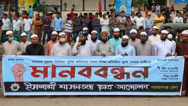 সোমবার ইসলামী শাসনতন্ত্র ছাত্র আন্দোলন নারায়ণগঞ্জ জেলার উদ্যোগে শিবু মার্কেট মোড়ে শাখা সভাপতি আব্দুল্লাহ মুহাম্মাদ হাসান এর সভাপতিত্বে এবং সাধারন সম্পাদক মুহাম্মাদ আনোয়ার হোসাইন এর সঞ্চালনায় সারা দেশের সকল শিক্ষাপ্রতিষ্ঠান খুলে দেয়ার দাবিতে মানববন্ধন অনুষ্ঠিত হয়। এতে প্রধান অতিথি হিসেবে উপস্থিত ছিলেন বাংলাদেশ মুজাহিদ কমিটি নারায়ণগঞ্জ জেলার সম্মানিত ছদর মাওলানা মুজিবুর রহমান।।