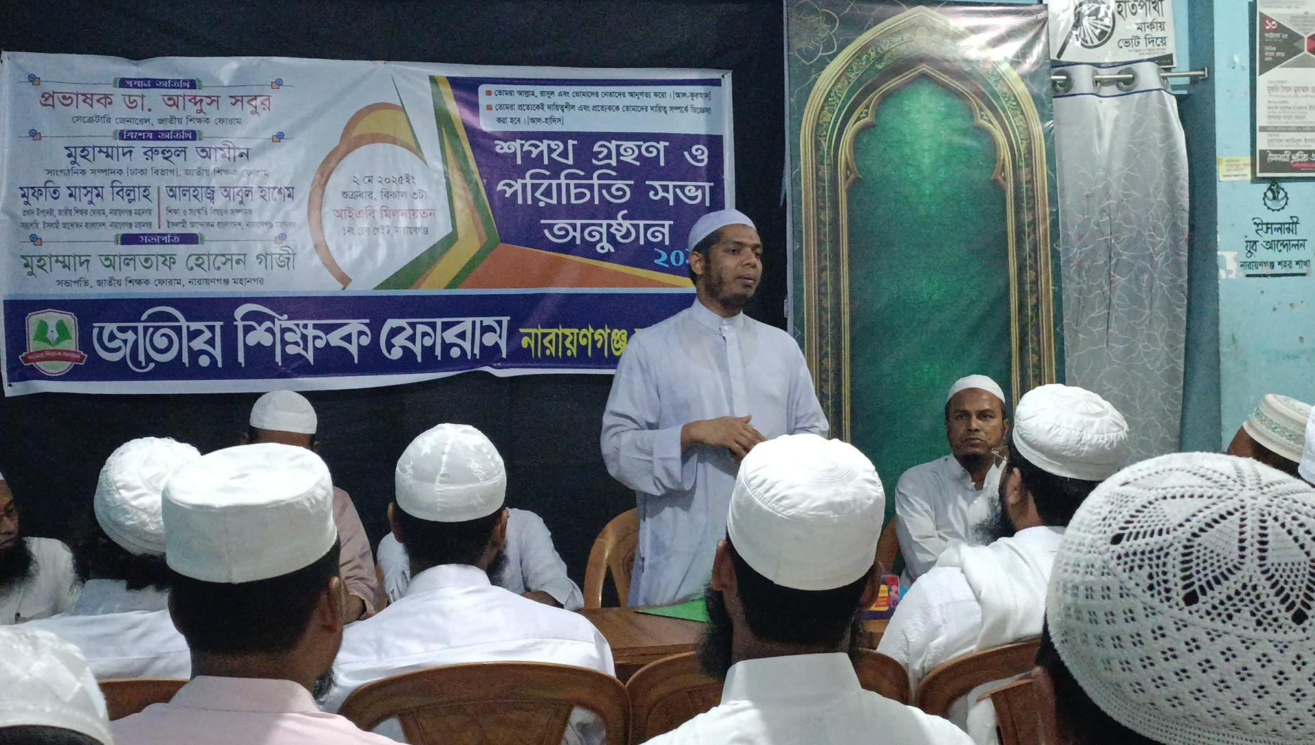 আজ ৩ মে শুক্রবার বিকেলে জাতীয় শিক্ষক ফোরামের কার্যালয়ে নারায়ণগঞ্জ মহানগর আয়োজিত ২০২৫-২৫ ইং সেশনে নবনির্বাচিত দায়িত্বশীলদের পরিচিতি সভা ও শপথ অনুষ্ঠানে প্রধান অতিথির বক্তব্যে তিনি উপর্যুক্ত কথা বলেন।