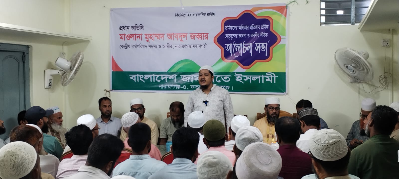 নারায়ণগঞ্জ মহানগরী শ্রমিক কল্যান ফেডারেশনের সভাপতি হাফেজ আবদুুল মোমিনের সভাপতিত্বে জেলা শ্রমিক কল্যান ফেডারেশনের সেক্রেটারি রেদুয়ানুল আজীমের সঞ্চালনায় আলোচনা সভায় বিশেষ অতিথি ছিলেন জেলা জামায়াতের সহকারী সেক্রেটারি আবু সাঈদ মুন্না, জেলা শ্রমিক কল্যান ফেডারেশনের সভাপতি আব্দুল মান্নান, মহানগর সাধারণ সম্পাদক সোলাইমান হোসাইন মুন্না সহ জেলা ও মহানগরীর নেতৃবৃন্দ তাদের ভাবনা গুলো তুলে ধরেন ।