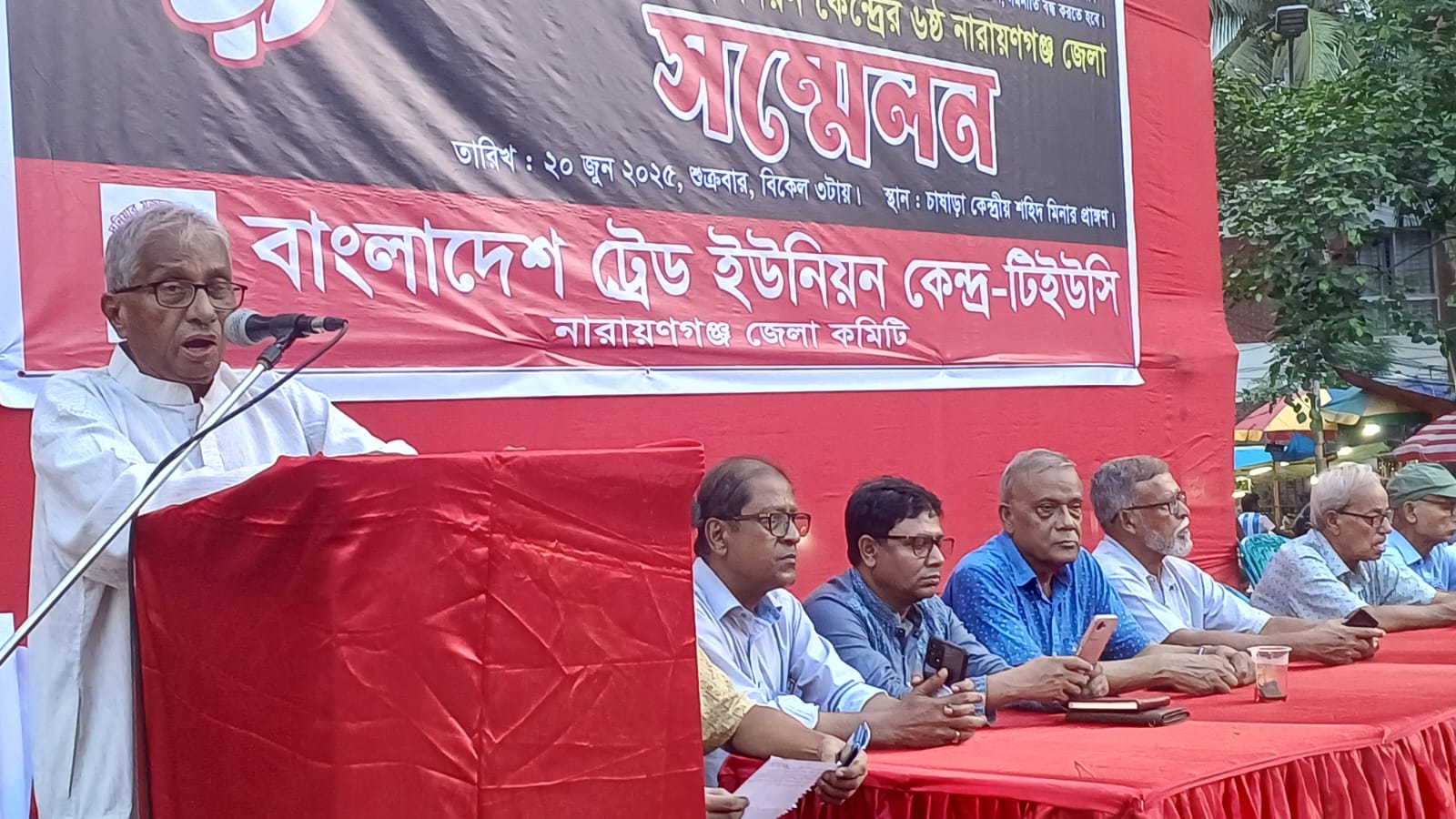 শ্রমিকদের জন্য স্থায়ী মজুরি কমিশন গঠন করে ৩০ হাজার টাকা জাতীয় ন্যূনতম মজুরি ঘোষণা, অবাধ ট্রেড ইউনিয়ন নিশ্চিত করা, শ্রমিক ছাঁটাই-নির্যাতন, দমননীতি বন্ধ করা, দেশের সংবিধান এবং আইএলও কনভেনশন অনুসারে শ্রম আইন সংশোধন করে কার্যকর করাসহ শ্রম সংস্কার কমিশনের সুপারিশ বাস্তবায়নের দাবি জানিয়েছে বাংলাদেশ ট্রেড ইউনিয়ন কেন্দ্র (টিইউসি) নারায়ণগঞ্জ জেলার ৬ষ্ঠ সম্মেলন অনুষ্ঠিত হয়েছে। ২০ জুন (শুক্রবার) বিকেল ৪ টায় নারায়ণগঞ্জ কেন্দ্রীয় শহীদ মিনার প্রাঙ্গণে শ্রমিক নেতা শহিদুল্লাহ চৌধুরী মঞ্চে এ সম্মেলন অনুষ্ঠিত হয়। সম্মেলন উদ্বোধন করেন টিইউসি’র কেন্দ্রীয় কমিটির ভারপ্রাপ্ত সভাপতি একে এম মাহবুব আলম, সভাপতিত্ব করেন টিইউসি’র জেলা কমিটির সভাপতি আঃ হাই শরীফ, বক্তব্য রাখেন কেন্দ্রীয় কমিটির যুগ্ন সাধারণ সম্পাদক আবুল কালাম আজাদ, অর্থ সম্পাদক কাজী রুহুল আমিন, সদস্য মন্টু ঘোষ, হাফিজুল ইসলাম, জেলা কমিটির সাধারণ সম্পাদক বিমল কান্তি দাস, যুগ্ন সাধারণ সম্পাদক ইকবাল হোসেন, বাংলাদেশ গার্মেন্ট ও সোয়েটার্স শ্রমিক ট্রেড ইউনিয়ন কেন্দ্র জেলার সভাপতি এম এ শাহীন, গার্মেন্ট শ্রমিক ট্রেড ইউনিয়ন কেন্দ্র জেলার সভাপতি দুলাল সাহা প্রমুখ।