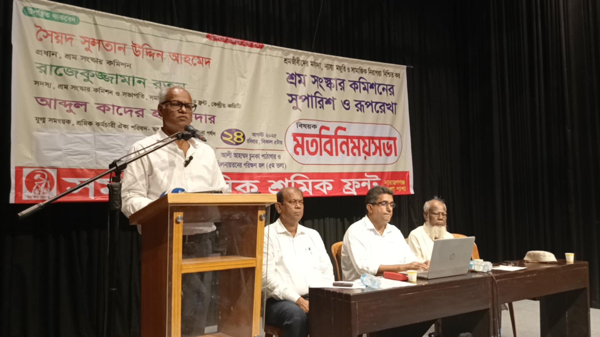 মাজতান্ত্রিক শ্রমিক ফ্রন্টের নারায়ণগঞ্জ জেলার উদ্যোগে শ্রমজীবীদের মর্যাদা, ন্যায্য মজুরি ও সামাজিক নিরাপত্তা নিশ্চিত করতে শ্রম সংস্কার কমিশনের সুপারিশ ও রূপরেখা এবং শ্রমিক সংগঠনসমূহের করনীয় শীর্ষক মতবিনিময়সভা আজ বিকাল ৫ টায় আলী আহম্মদ চুনকা পাঠাগার ও মিলনায়তন পরীক্ষণ হলে অনুষ্ঠিত হয়। অসুস্থ থাকায় মতবিনিময়সভায় শ্রম সংস্কার কমিশন প্রধান সৈয়দ সুলতান উদ্দিন আহম্মেদ অনলাইনে সরাসরি বক্তব্য রাখেন। মতবিনিময়সভায় বক্তব্য রাখেন শ্রম সংস্কার কমিশনের সদস্য ও সমাজতান্ত্রিক শ্রমিক ফ্রন্ট কেন্দ্রীয় কমিটির সভাপতি ও শ্রমিক-কর্মচারী ঐক্য পরিষদ (স্কপ) এর অন্যতম শীর্ষ নেতা রাজেকুজ্জামান রতন, শ্রমিক কর্মচারী ঐক্য পরিষদ-স্কপের কেন্দ্রীয় যুগ্ম সমন্বয়ক আব্দুল কাদের হাওলাদার। সমাজতান্ত্রিক শ্রমিক ফ্রন্ট নারায়ণগঞ্জ জেলার সভাপতি আবু নাঈম খান বিপ্লবের সভাপতিত্বে ও সাধারণ সম্পাদক সেলিম মাহমুদের সঞ্চালনায় জেলার নেতৃবৃন্দের মধ্যে আরও বক্তব্য রাখেন বাংলাদেশ ট্রেড ইউনিয়ন কেন্দ্র নারায়ণগঞ্জ জেলার সভাপতি হাফিজুল ইসলাম, জাতীয় শ্রমিক ফেডারেশন নারায়ণগঞ্জ জেলার সভাপতি হাফিজুর রহমান, গার্মেন্টস শ্রমিক সংহতির কেন্দ্রীয় কমিটির সহসভাপ্রধান অঞ্জন দাস, গার্মেন্টস শ্রমিক টিইউসি নারায়ণগঞ্জ জেলার সভাপতি দুলাল সাহা, জাতীয় শ্রমিক জোট বাংলাদেশ নারায়ণগঞ্জ জেলার সভাপতি সৈয়দ হোসেন, বাংলাদেশের জাতীয় শ্রমিক জোট জেলার সংগঠক সোলেমান দেওয়ান, গার্মেন্টস ও সোয়েটার ট্রেড ইউনিয়ন কেন্দ্রের জেলার সাধারণ সম্পাদক ইকবাল হোসেন, রি-রোলিং স্টিল মিলস শ্রমিক ফ্রন্ট জেলার সাধারণ সম্পাদক এসএম কাদির।