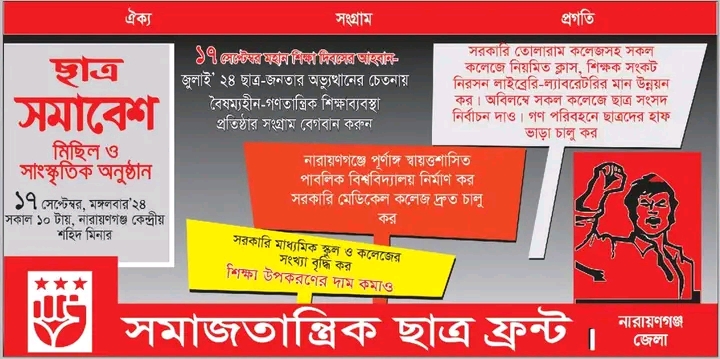 ছাত্র-গণঅভ্যুত্থানের আকাঙ্খাকে ধারণ করে বৈষম্যহীন শিক্ষার দাবিতে আগামী ১৭ সেপ্টেম্বর, মঙ্গলবার সকাল ১০টায় নারায়ণগঞ্জ কেন্দ্রীয় শহিদ মিনারে মহান শিক্ষা দিবস উপলক্ষ্যে ছাত্র সমাবেশ, র্যালি ও সাংস্কৃতিক অনুষ্ঠান অনুষ্ঠিত হবে। সমাজতান্ত্রিক ছাত্র ফ্রন্ট নারায়ণগঞ্জ জেলার আহŸায়ক ছাত্রনেতা সাইফুল ইসলামের সভাপতিত্বে বক্তব্য রাখবেন বাংলাদেশের সমাজতান্ত্রিক দল- বাসদ নারায়ণগঞ্জ জেলার আহŸায়ক কমরেড নিখিল দাস, সদস্য সচিব আবু নাঈম খান বিপ্লব, নারায়ণগঞ্জ সাংস্কৃতিক জোটের সাধারণ সম্পাদক ধীমান সাহা জুয়েল, সমাজতান্ত্রিক ছাত্র ফ্রন্ট কেন্দ্রীয় কমিটির সভাপতি ছাত্রনেতা মুক্তা বাড়ৈ, অর্থ সম্পাদক সুলতানা আক্তার, সমাজতান্ত্রিক ছাত্র ফ্রন্ট নারায়ণগঞ্জ জেলার সাধারণ সম্পাদক নাছিমা সরদার প্রমুখ।