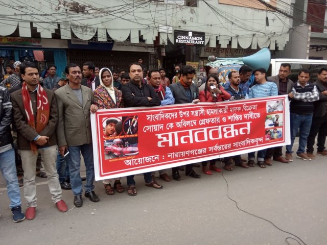 নারায়ণগঞ্জ সিটি প্রেসক্লাবের সভাপতি সাইফুল্লাহ মাহমুদ টিটুর সভাপতিত্বে এবং নারায়ণগঞ্জ ফটো জার্নালিস্ট এসোসিয়েশনের সাধারণ সম্পাদক এনামুল হক সিদ্দিকীর সঞ্চালনায় মানববন্ধনে বক্তব্য রাখেন, নারায়ণগঞ্জ ফটো জার্নালিস্ট এসোসিয়েশনের সভাপতি মাহমুদুল হাসান কচি, ফতুল্লা মডেল প্রেসক্লাবের সভাপতি আনিসুজ্জামান অনু, সাধারণ সম্পাদক ফরিদ আহমেদ বাঁধন, দৈনিক ভোরের কথা পত্রিকার সম্পাদক আরিফুজ্জামান, অনলাইন নিউজ পোর্টাল টপ নিউজ ডট কম এর সম্পাদক মহসীন আলম, দৈনিক অপরাধ রিপোর্ট পত্রিকার সম্পাদক মাসুদুর রহমান দিপু, সিটি প্রেসক্লাবের সাধারণ সম্পাদক শফিকুল ইসলাম আরজু, বন্দর থানা প্রেসক্লাবের সভাপতি সাব্বির সেন্টু, অনলাইন নিউজ পোর্টাল ঢাকার নিউজ ডট কম এর প্রধান সম্পাদক ও মানবাধিকার কর্মী সোনিয়া দেওয়ান প্রীতি, ফতুল্লা প্রেসক্লাবের সাধারণ সম্পাদক আব্দুর রহিম, দৈনিক খবর পত্রের জেলা প্রতিনিধি মনির হোসেন, সাংবাদিক সাহাদাৎ হোসেন ভূইয়া ও সাংবাদিক জামান খান।