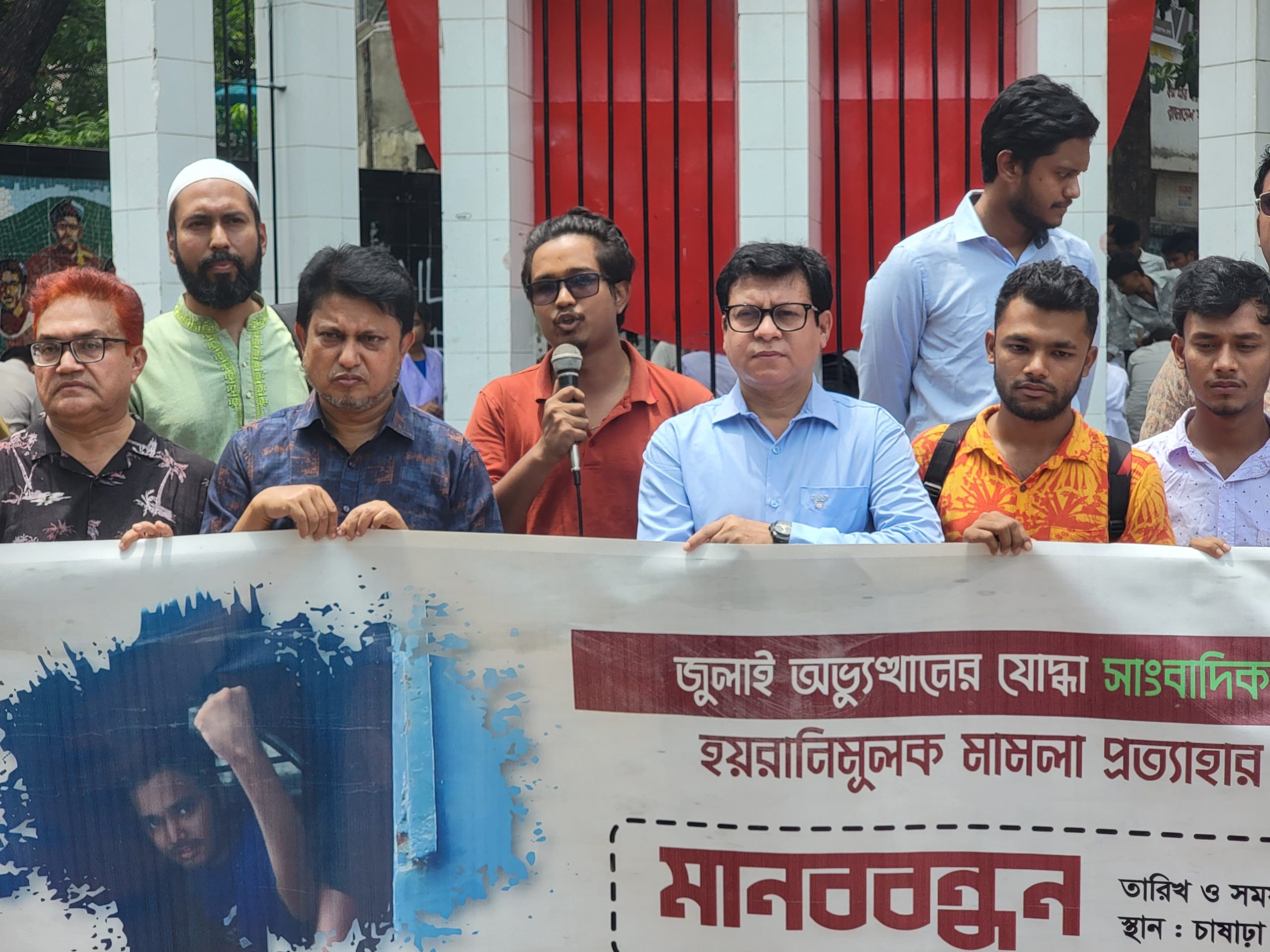 নারায়ণগঞ্জে জুলাই অভ্যুত্থানের যোদ্ধা সাংবাদিক জিসানের বিরুদ্ধে হয়রানিমূলক মামলা প্রত্যাহার ও নিঃশর্ত মুক্তির দাবিতে মানববন্ধন অনুষ্ঠিত হয়েছে। সকালে নারায়ণগঞ্জের সাংবাদিকবৃন্দের ব্যানারে শহরের চাষাঢ়ায় কেন্দ্রীয় শহীদ মিনারে মানববন্ধনটি অনুষ্ঠিত হয়। অনলাইন পোর্টাল প্রেস নারায়ণগঞ্জের সম্পাদক ফখরুল ইসলামের সভাপতিত্বে মানববন্ধনে বক্তব্য রাখেন নারায়ণগঞ্জ প্রেসক্লাবের সাধারণ সম্পাদক রফিকুল ইসলাম জীবন, সহসভাপতি বিল্লাল হোসেন রবিন, ফতুল্লা প্রেসক্লাবের সভাপতি আব্দুর রহিম, সিদ্ধিরগঞ্জ প্রেসক্লাবের সভাপতি হোসেন চিশতি শিপলু, নারায়নগঞ্জ সাংবাদিক ইউনিয়নের কার্যকরী কমিটির সদস্য সাবিত আল হাসান, সিয়াম হোসেন সৌরভ, মোবাশ্বির শ্রাবন ।