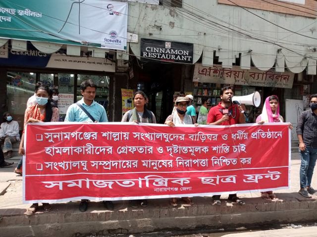সুনামগঞ্জের শাল্লা উপজেলার নোয়াগাঁও গ্রামে হিন্দু সম্প্রদায়ের বাড়িঘরে ও ধর্মীয় প্রতিষ্ঠানে সাম্প্রদায়িক হামলা, ভাংচুর ও লুটপাটের ঘটনায় জড়িতদের অবিলম্বে গ্রেফতার ও দৃষ্টান্তমূলক শাস্তি ও সারাদেশে সংখ্যালঘু সম্প্রদায়ের মানুষের নিরাপত্তা নিশ্চিত করার দাবিতে সমাজতান্ত্রিক ছাত্র ফ্রন্ট নারায়ণগঞ্জ জেলার উদ্যোগে আজ সকাল ১১ টায় নারায়ণগঞ্জ প্রেস ক্লাবের সামনে মানববন্ধন অনুষ্ঠিত হয়। জেলা সভাপতি সুলতানা আক্তারের সভাপতিত্বে মানববন্ধনে বক্তব্য রাখেন জেলার সাধারণ সম্পাদক বেলাল হোসাইন, সমাজতান্ত্রিক ছাত্র ফ্রন্ট নারায়ণগঞ্জ জেলার সাংগঠনিক সম্পাদক শফিকুল ইসলাম শিমুল, অর্থ সম্পাদক মুন্নি সরদার, নারায়ণগঞ্জ জেলার সংগঠক ফয়সাল আম্মেদ রাতুল ও সাইফুল ইসলাম।