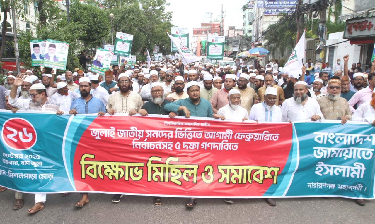 জুলাই জাতীয় সনদের ভিত্তিতে আগামী ফেব্রুয়ারিতে নির্বাচনসহ ৫ দফা গণদাবিতে কেন্দ্র ঘোষিত কর্মসূচির অংশ হিসেবে ৫- দফা দাবিতে বাংলাদেশ জামায়াতে ইসলামী নারায়ণগঞ্জ মহানগরীর উদ্যােগে বিক্ষোভ সমাবেশ ও মিছিল অনুষ্ঠিত হয়েছে।